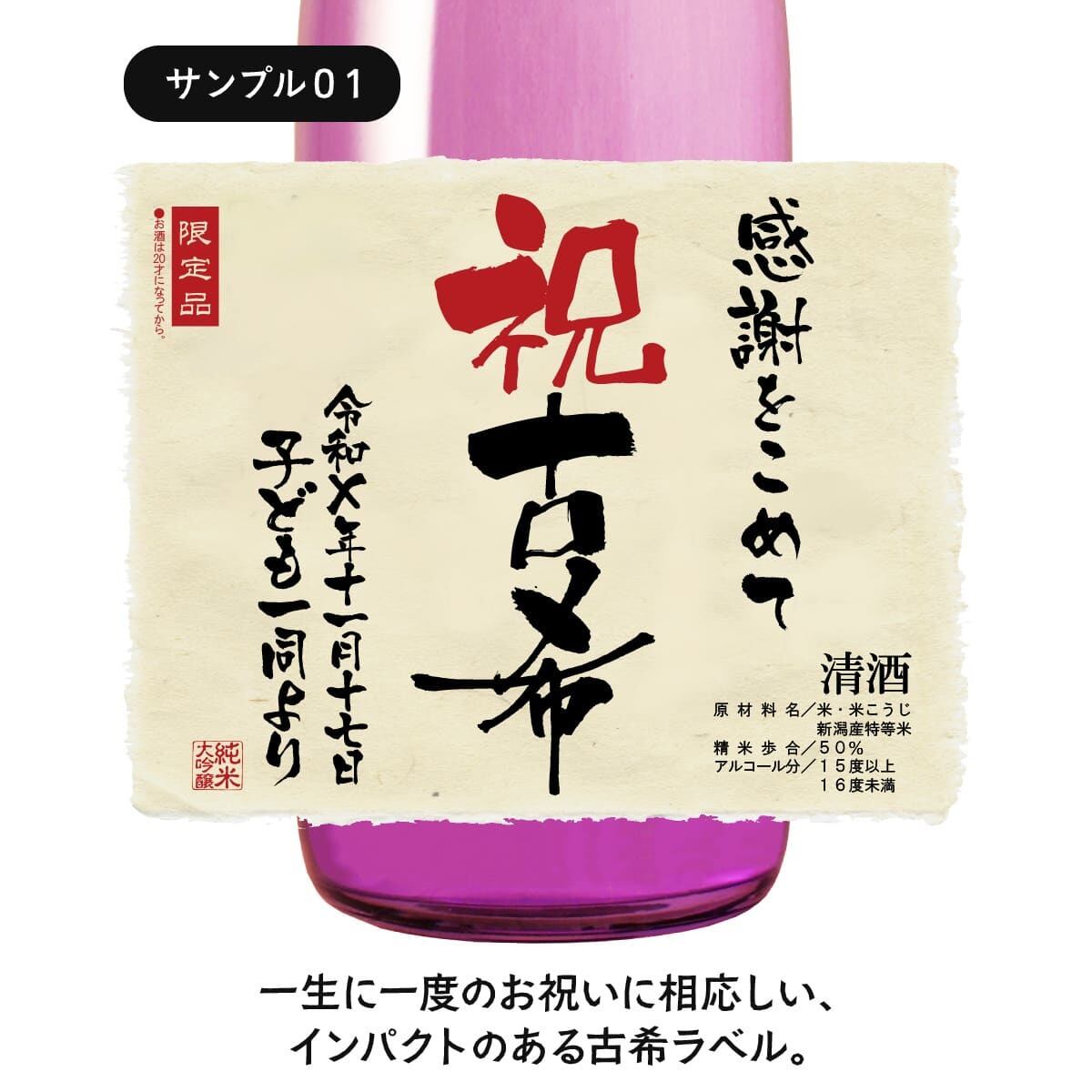 古希のお祝いにぴったりの薄紫色のボトルに、世界にひとつのオリジナルラベルをお付けいたします。ラベルは文字数制限なし、家紋やロゴ・イラスト等も可能です。お客さまのご希望に沿ったオーダメイドラベルをお作りいたします。