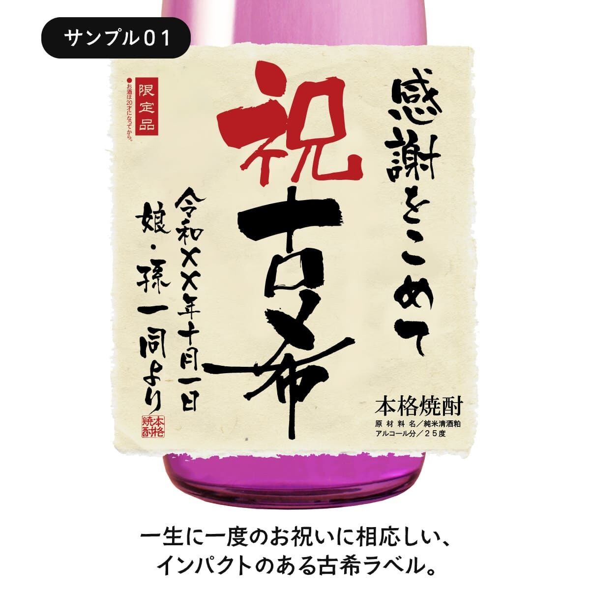 古希のお祝いにぴったりの薄紫色のボトルに、世界にひとつのオリジナルラベルをお付けいたします。ラベルは文字数制限なし、家紋やロゴ・イラスト等も可能です。お客さまのご希望に沿ったオーダメイドラベルをお作りいたします。