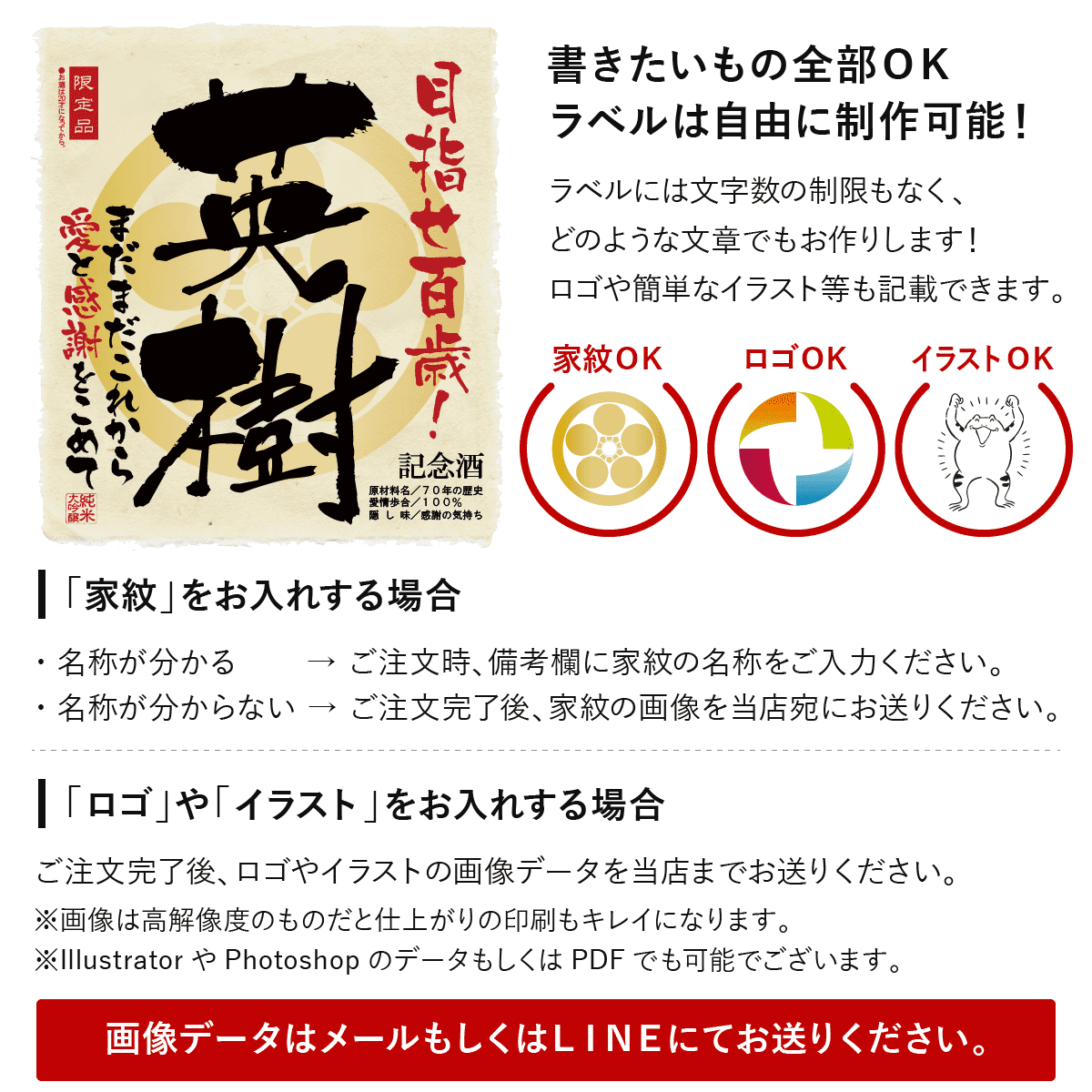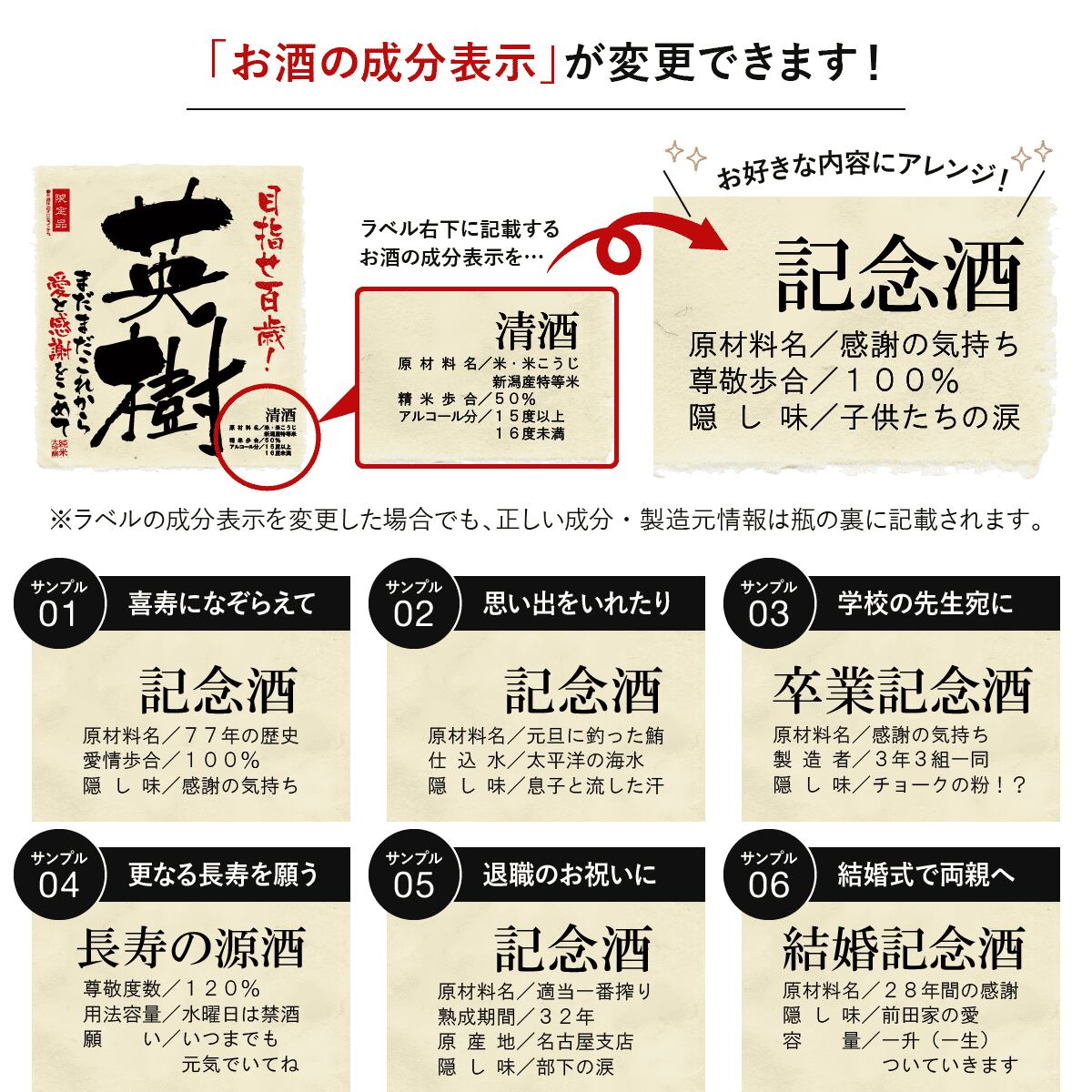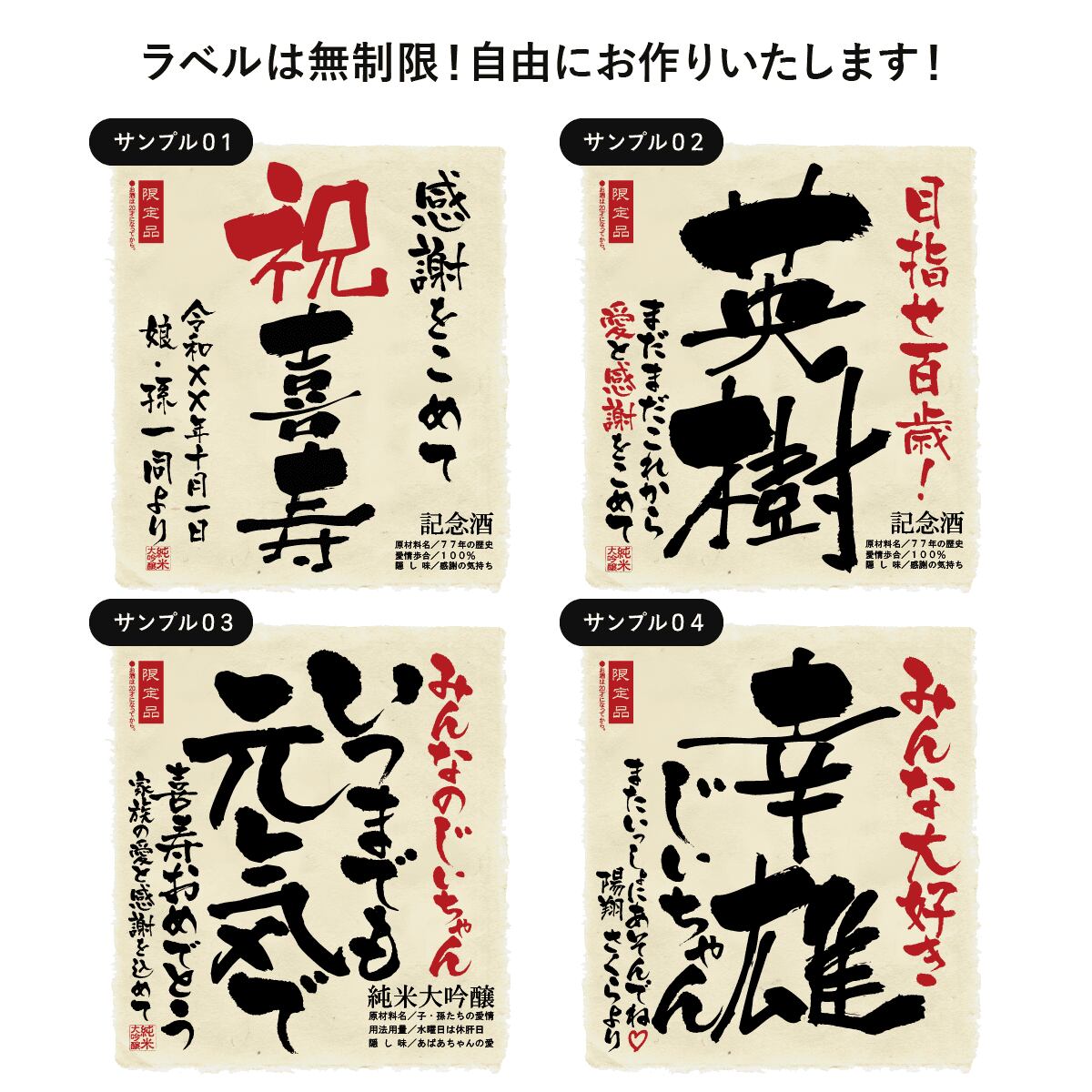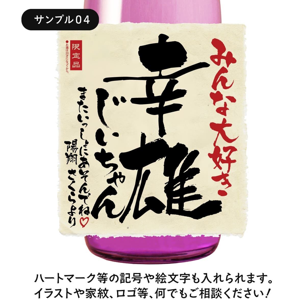 喜寿のお祝いにぴったりの薄紫色のボトルに、世界にひとつのオリジナルラベルをお付けいたします。ラベルは文字数制限なし、家紋やロゴ・イラスト等も可能です。お客さまのご希望に沿ったオーダメイドラベルをお作りいたします。