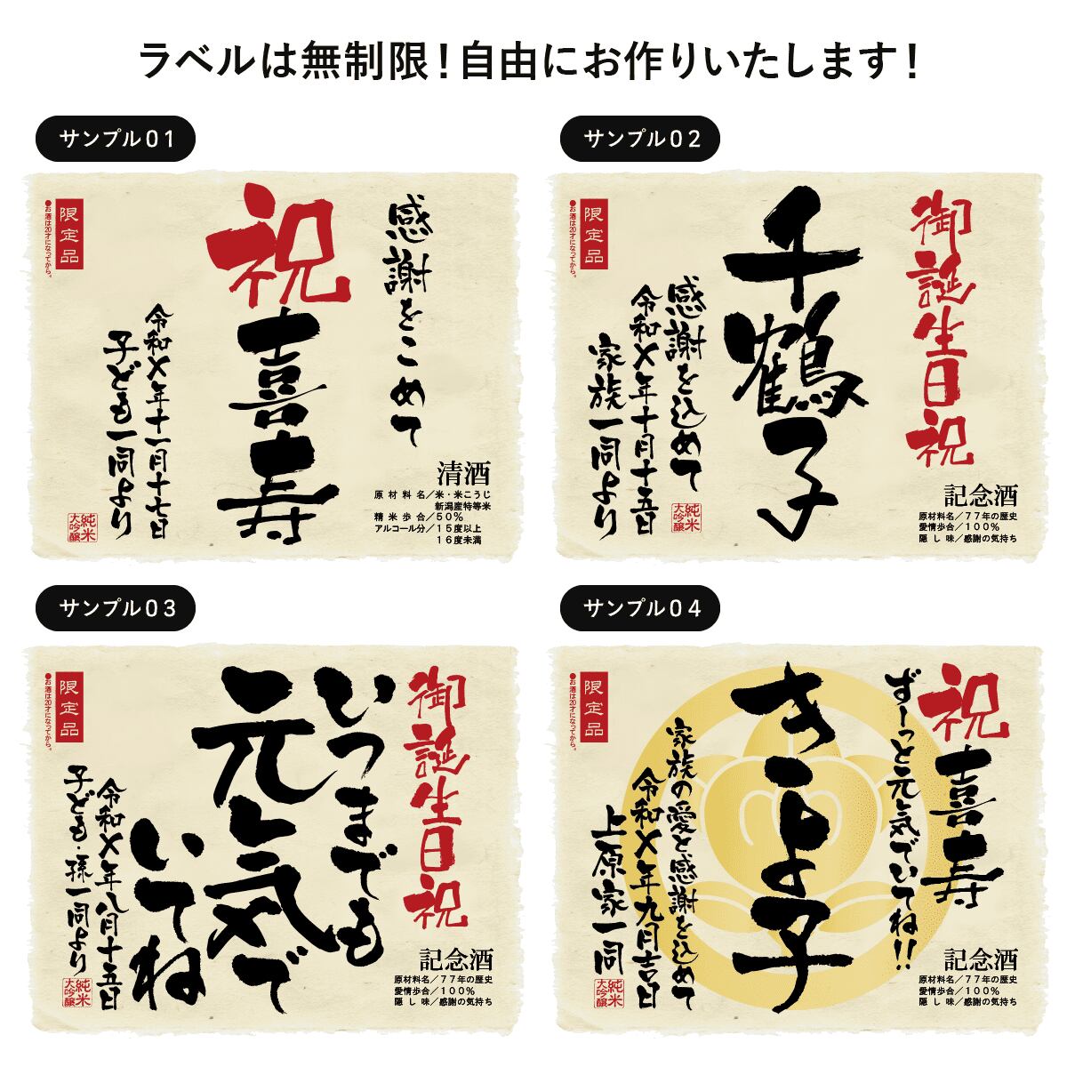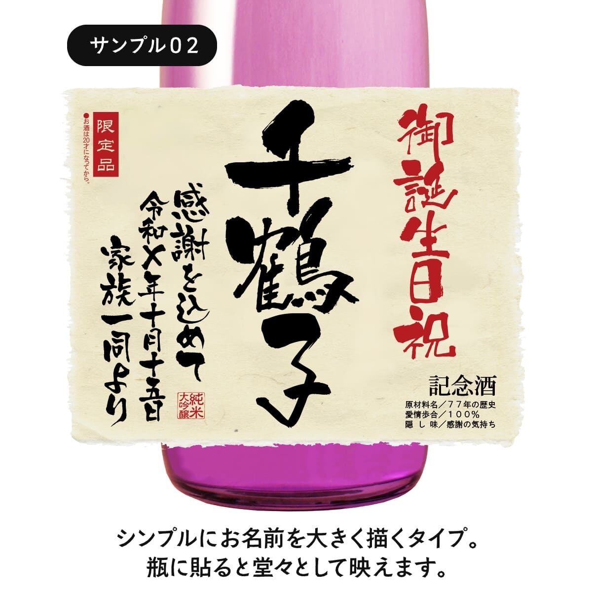 喜寿のお祝いにぴったりの薄紫色のボトルに、世界にひとつのオリジナルラベルをお付けいたします。ラベルは文字数制限なし、家紋やロゴ・イラスト等も可能です。お客さまのご希望に沿ったオーダメイドラベルをお作りいたします。