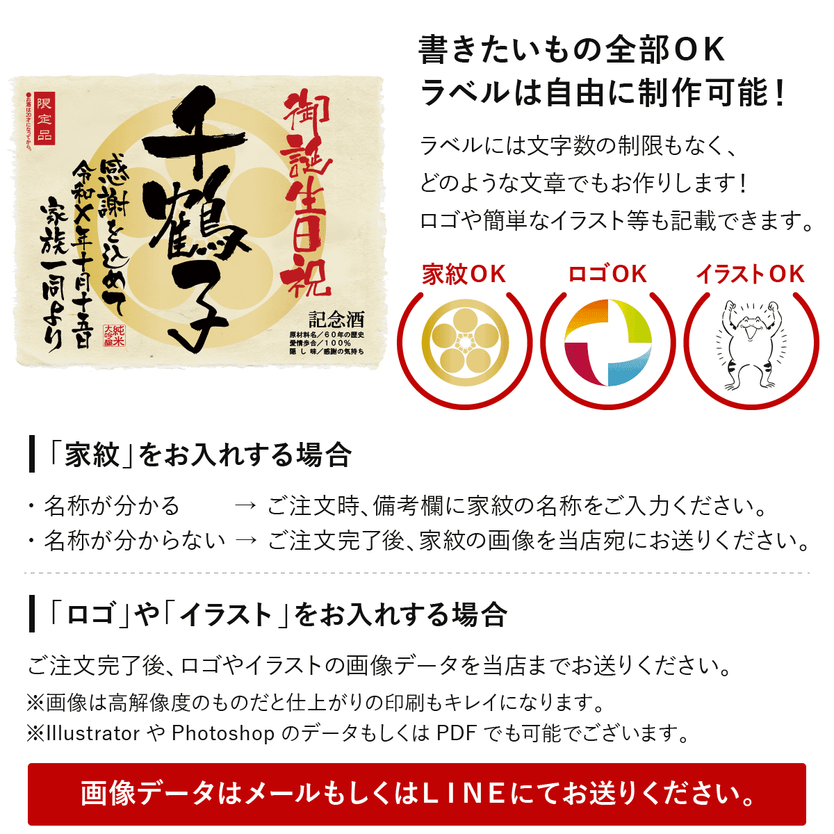 こちらの名入れ酒は当店営業日15時までのご注文で即日発送が可能です。お急ぎのお客様は「配送日付:指定なし」を選択の上、備考欄に『即日発送希望』とご入力くださいませ。※15時以降のご注文、及び、当店休業日のご注文は最短で翌営業日の発送となりますのでご注意ください。