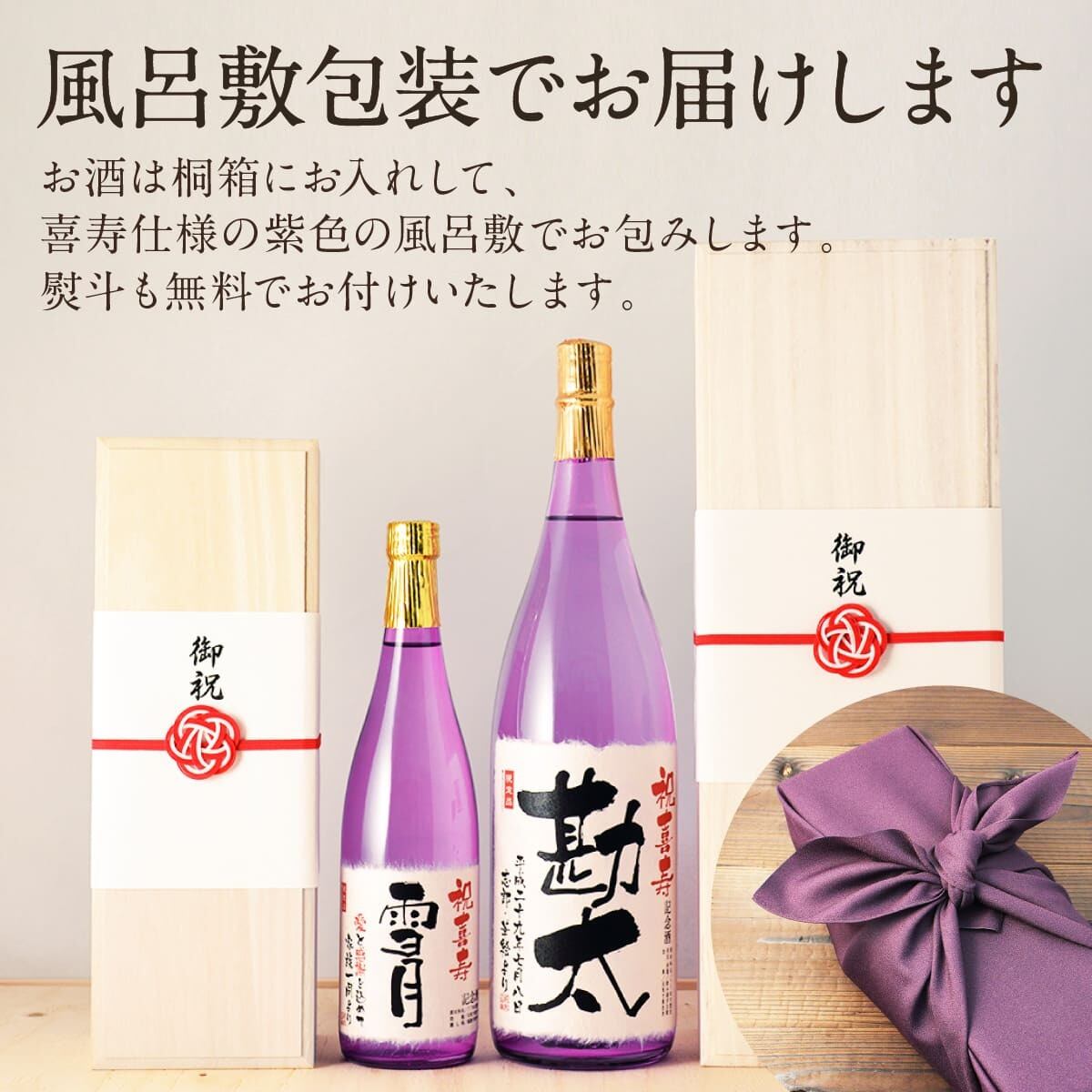お酒とメモリアル新聞は桐箱に入れ、瓶色と同色の紫色風呂敷でお包みしてお届けいたします。