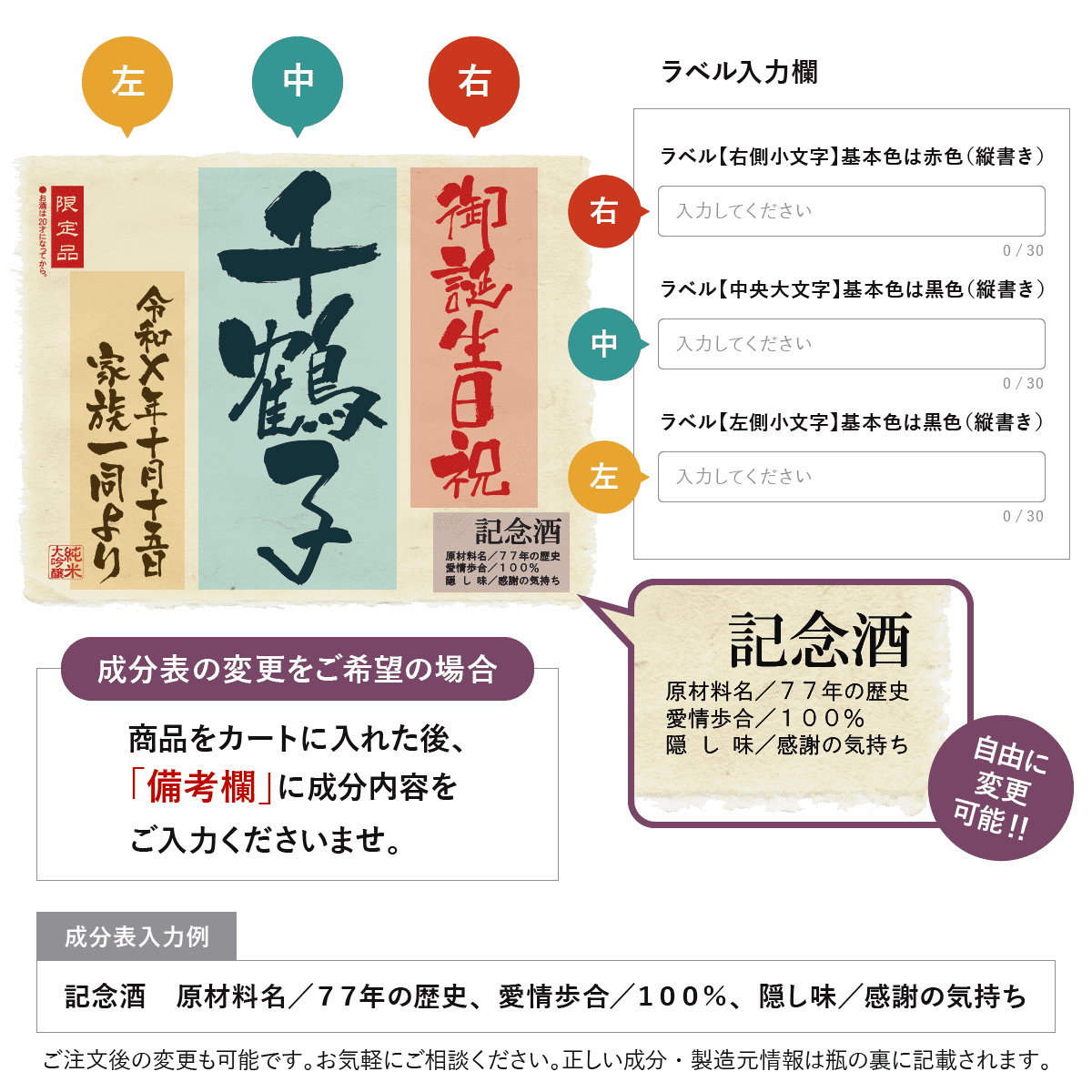 喜寿のお祝いにぴったりの薄紫色のボトルに、世界にひとつのオリジナルラベルをお付けいたします。ラベルは文字数制限なし、家紋やロゴ・イラスト等も可能です。お客さまのご希望に沿ったオーダメイドラベルをお作りいたします。