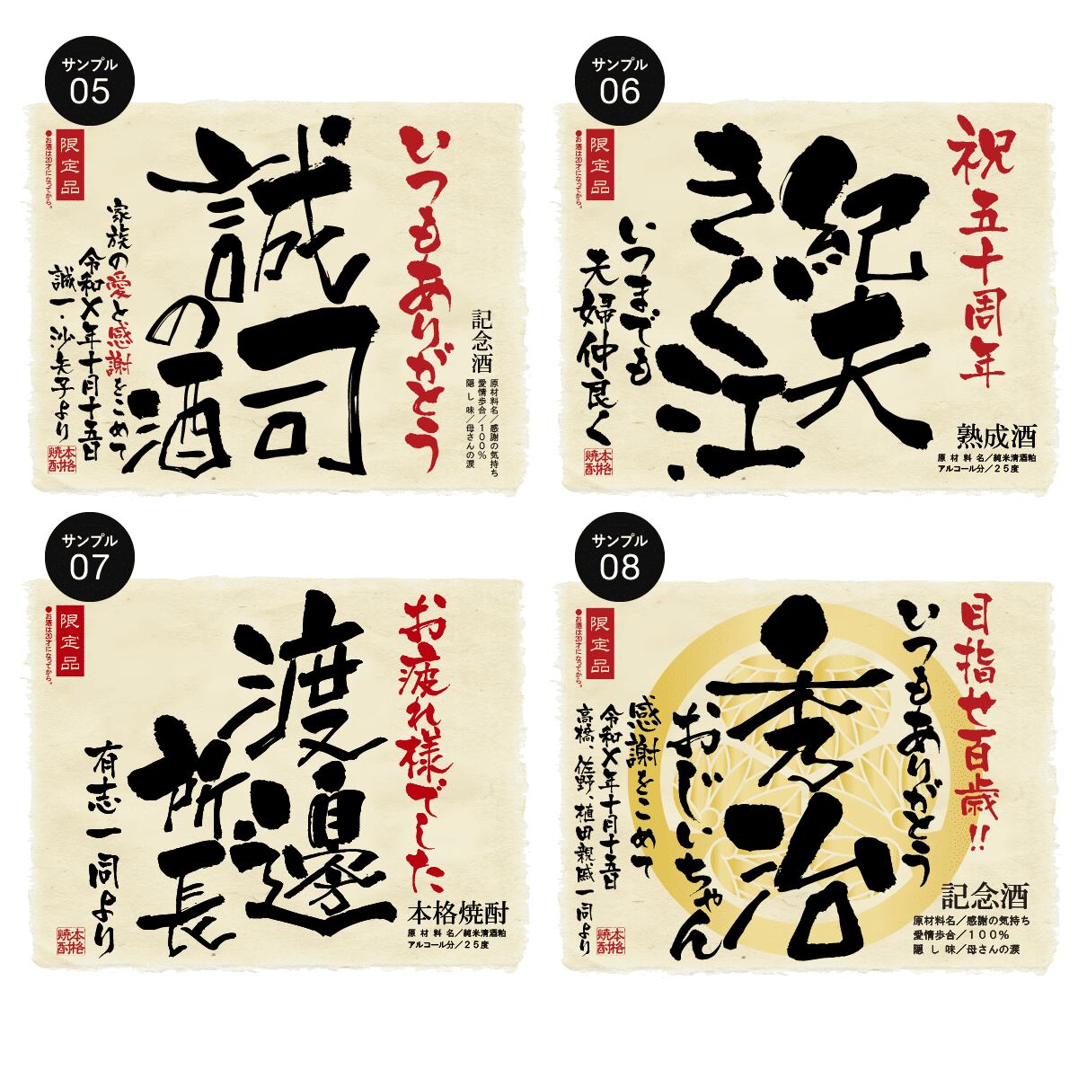傘寿のお祝いにぴったりの黄色のボトルに、世界にひとつのオリジナルラベルをお付けいたします。ラベルは文字数制限なし、家紋やロゴ・イラスト等も可能です。お客さまのご希望に沿ったオーダメイドラベルをお作りいたします。