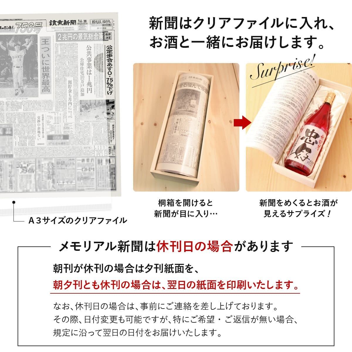 更に、ご希望の日付の1面を印刷した「メモリアル新聞」を1部お付けいたします。新聞日付は1874年~本日分までご用意しておりますので、誕生日や記念日等、お好きな日付をお選びくださいませ。※新聞社は「読売新聞」のみとなります。新聞社の指定はお受け出来ません。