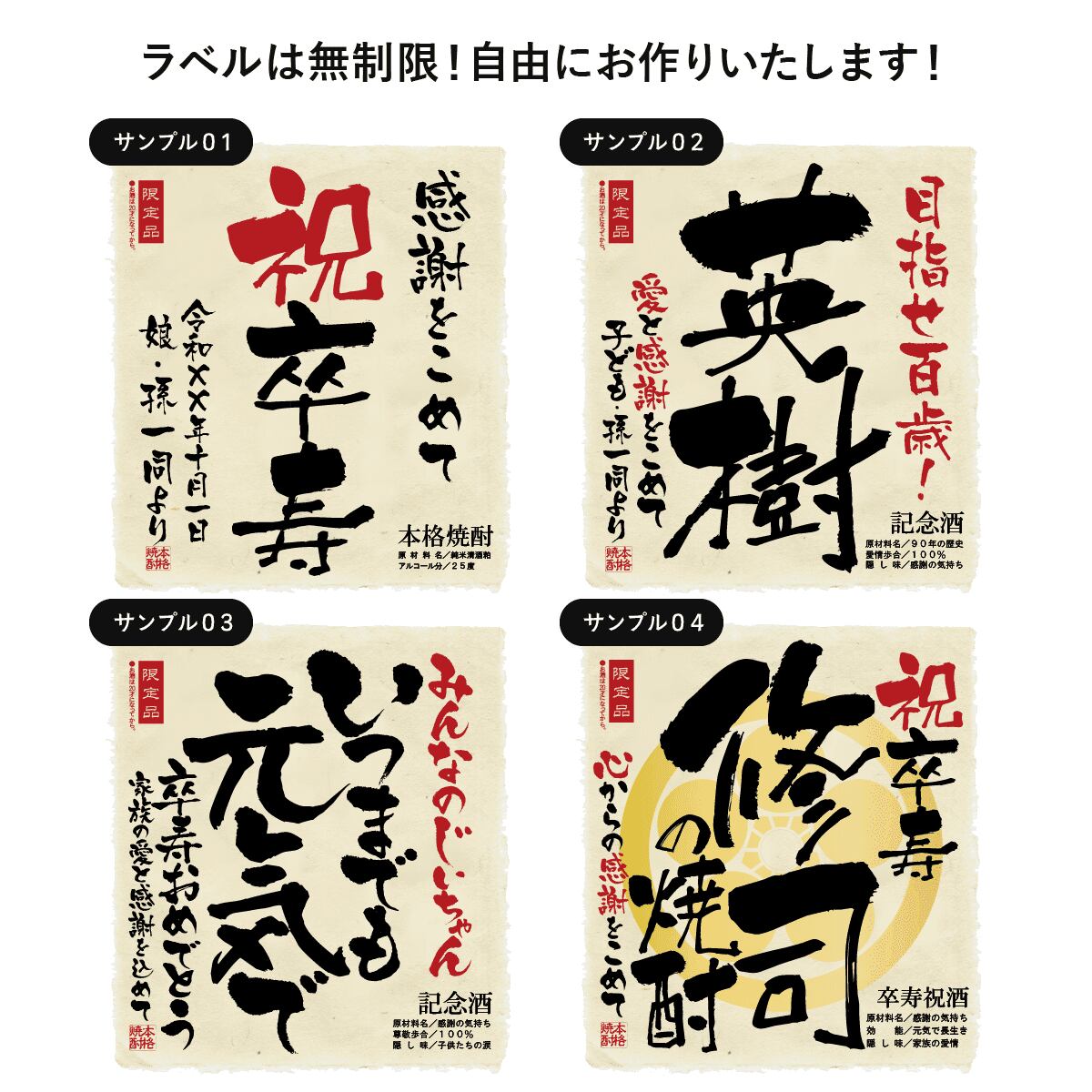 卒寿のお祝いにぴったりの薄紫色のボトルに、世界にひとつのオリジナルラベルをお付けいたします。ラベルは文字数制限なし、家紋やロゴ・イラスト等も可能です。お客さまのご希望に沿ったオーダメイドラベルをお作りいたします。