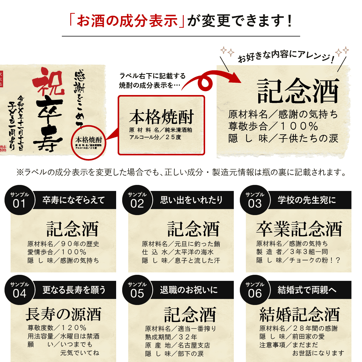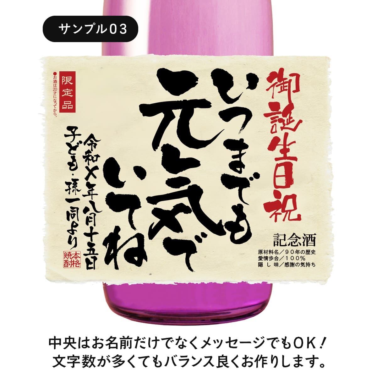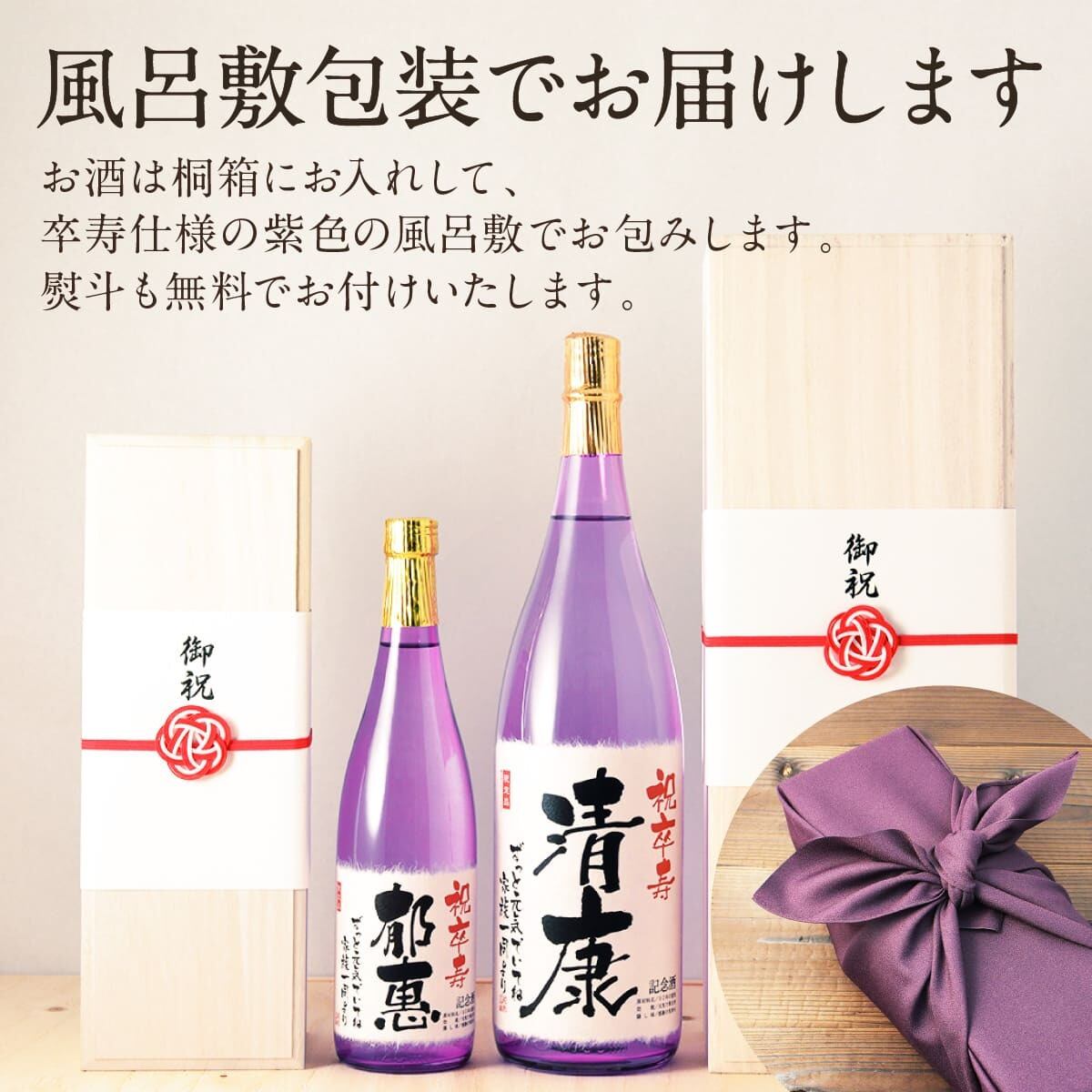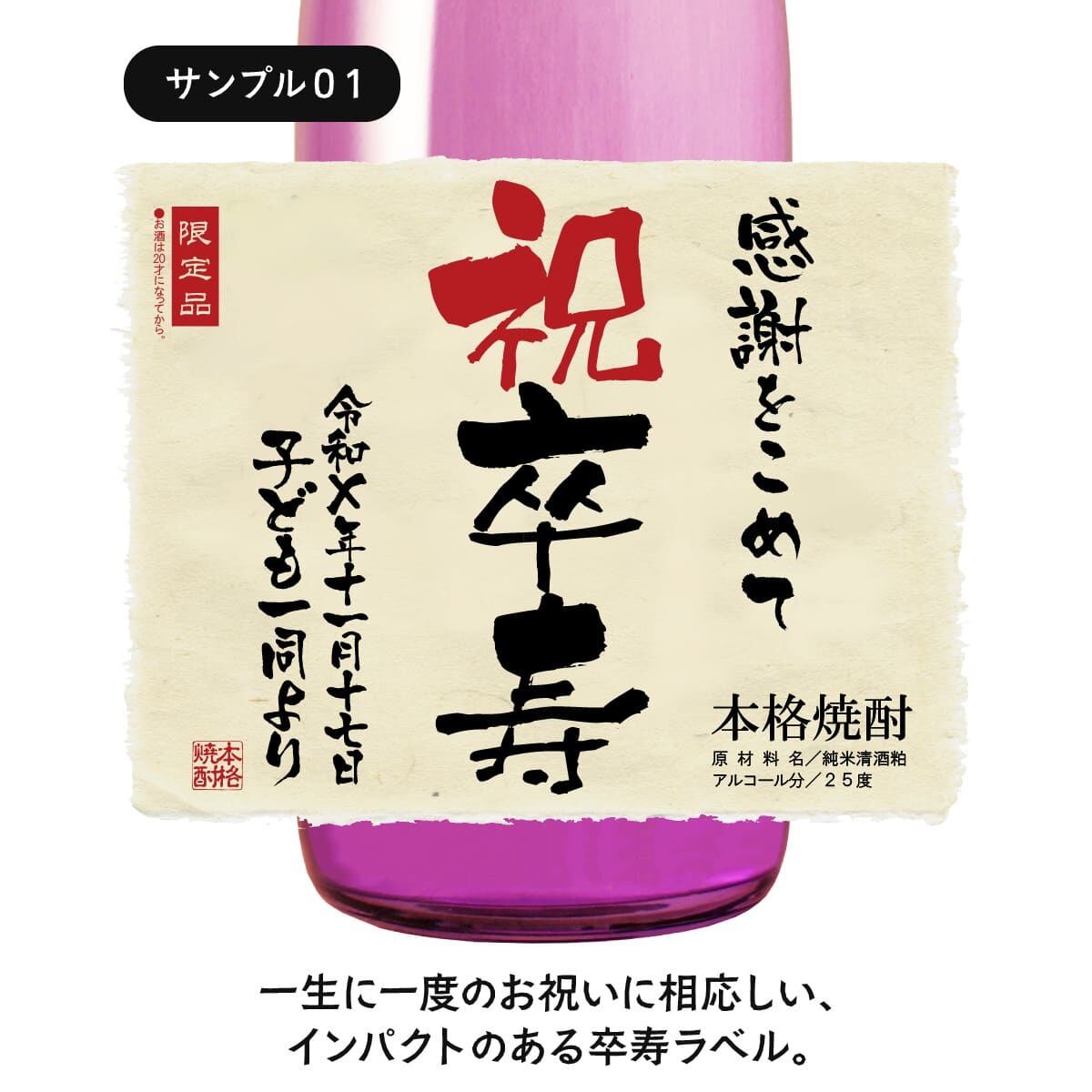卒寿のお祝いにぴったりの薄紫色のボトルに、世界にひとつのオリジナルラベルをお付けいたします。ラベルは文字数制限なし、家紋やロゴ・イラスト等も可能です。お客さまのご希望に沿ったオーダメイドラベルをお作りいたします。