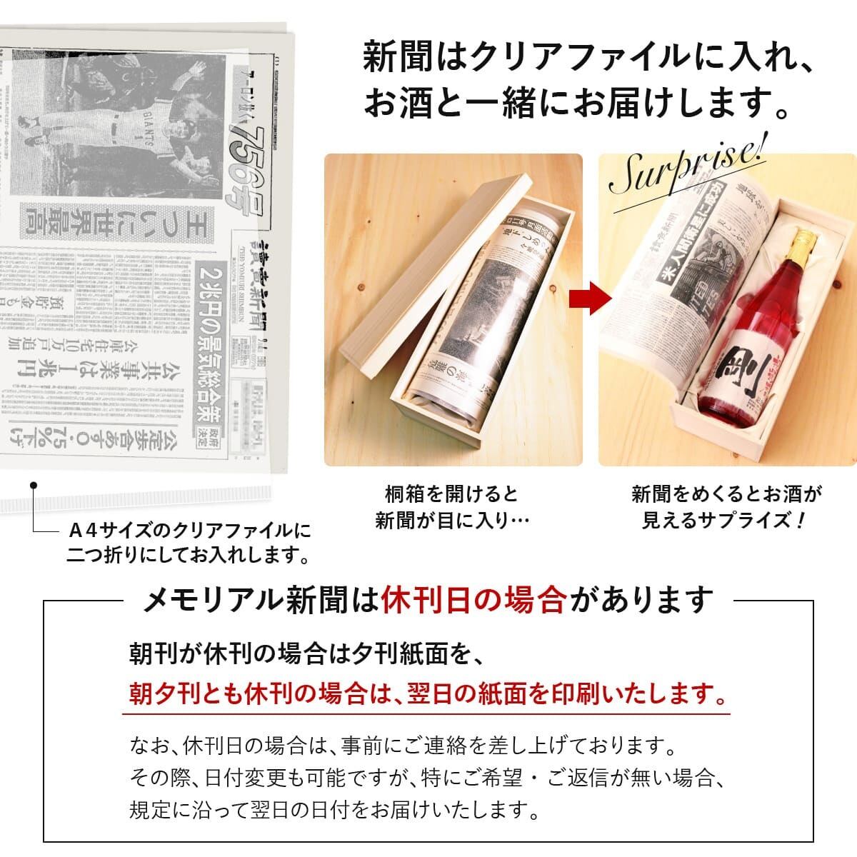 更に、ご希望の日付の1面を印刷した「メモリアル新聞」を1部お付けいたします。新聞日付は1874年~本日分までご用意しておりますので、誕生日や記念日等、お好きな日付をお選びくださいませ。※新聞社は「読売新聞」のみとなります。新聞社の指定はお受け出来ません。