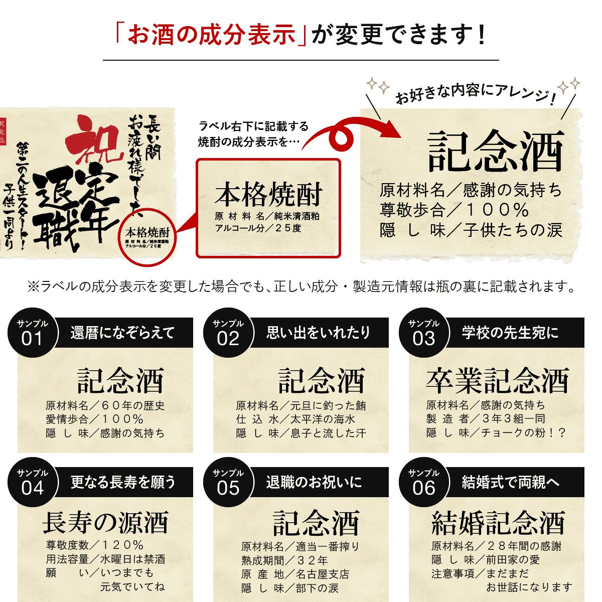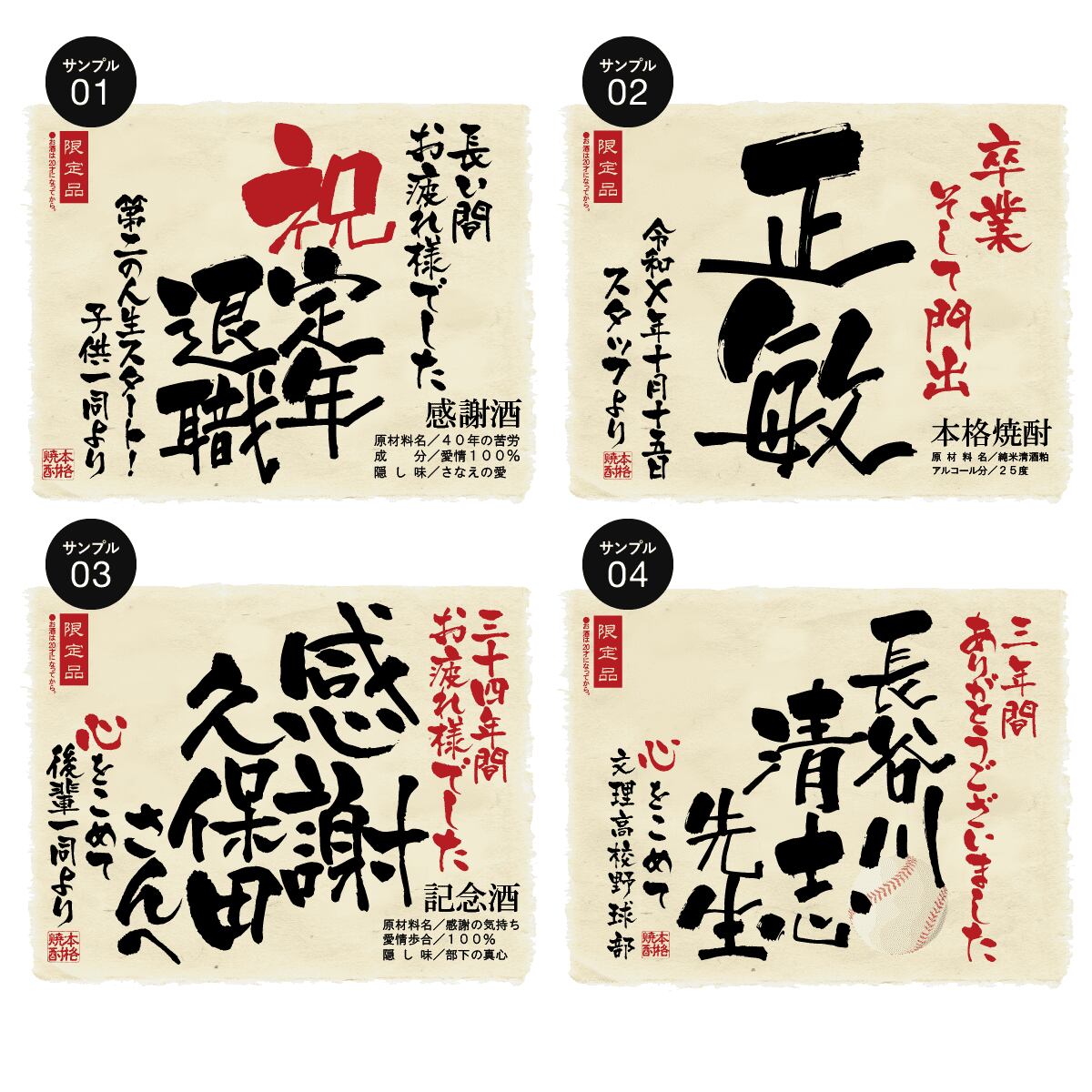 退職のお祝いに、世界にひとつのオリジナルラベルをお作りいたします。ラベルは文字数制限なし、ロゴや校章・イラスト等も可能です。お客さまのご希望に沿ったオーダメイドラベルをお作りいたします。