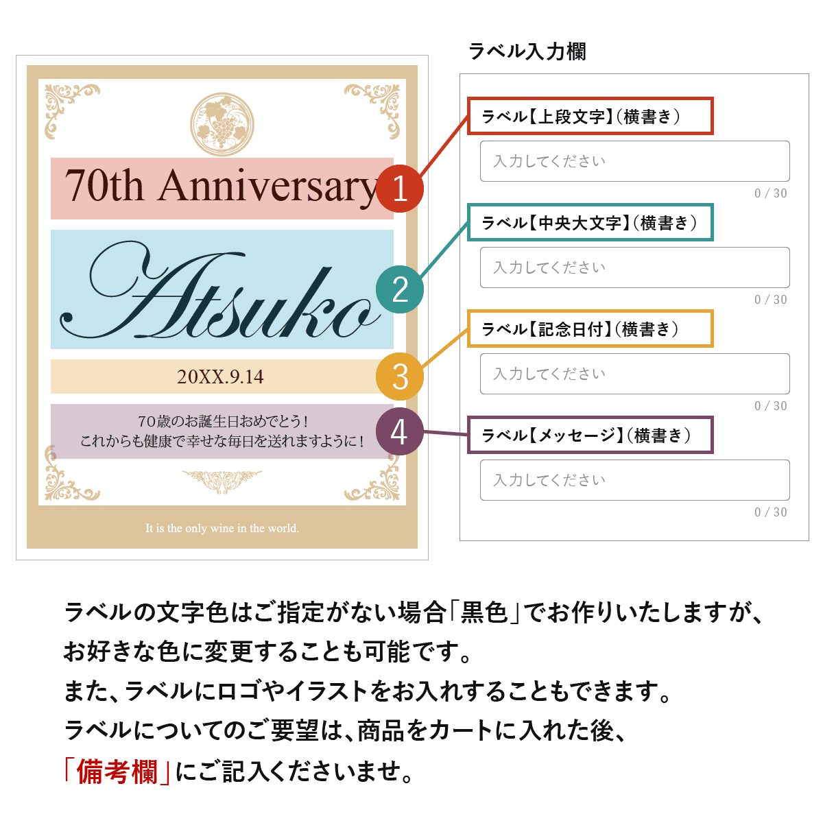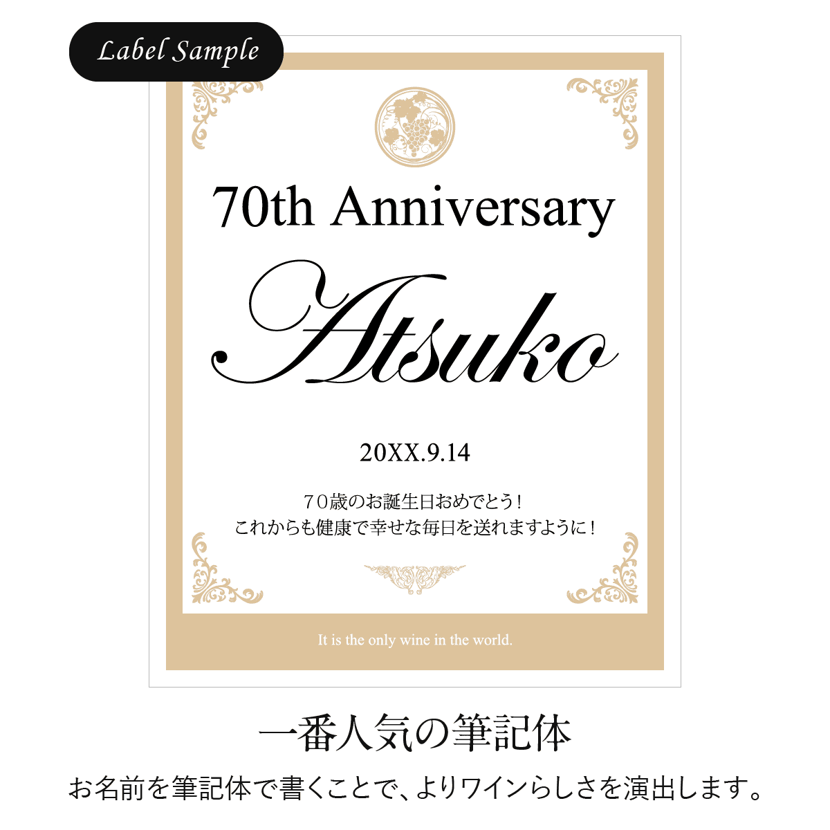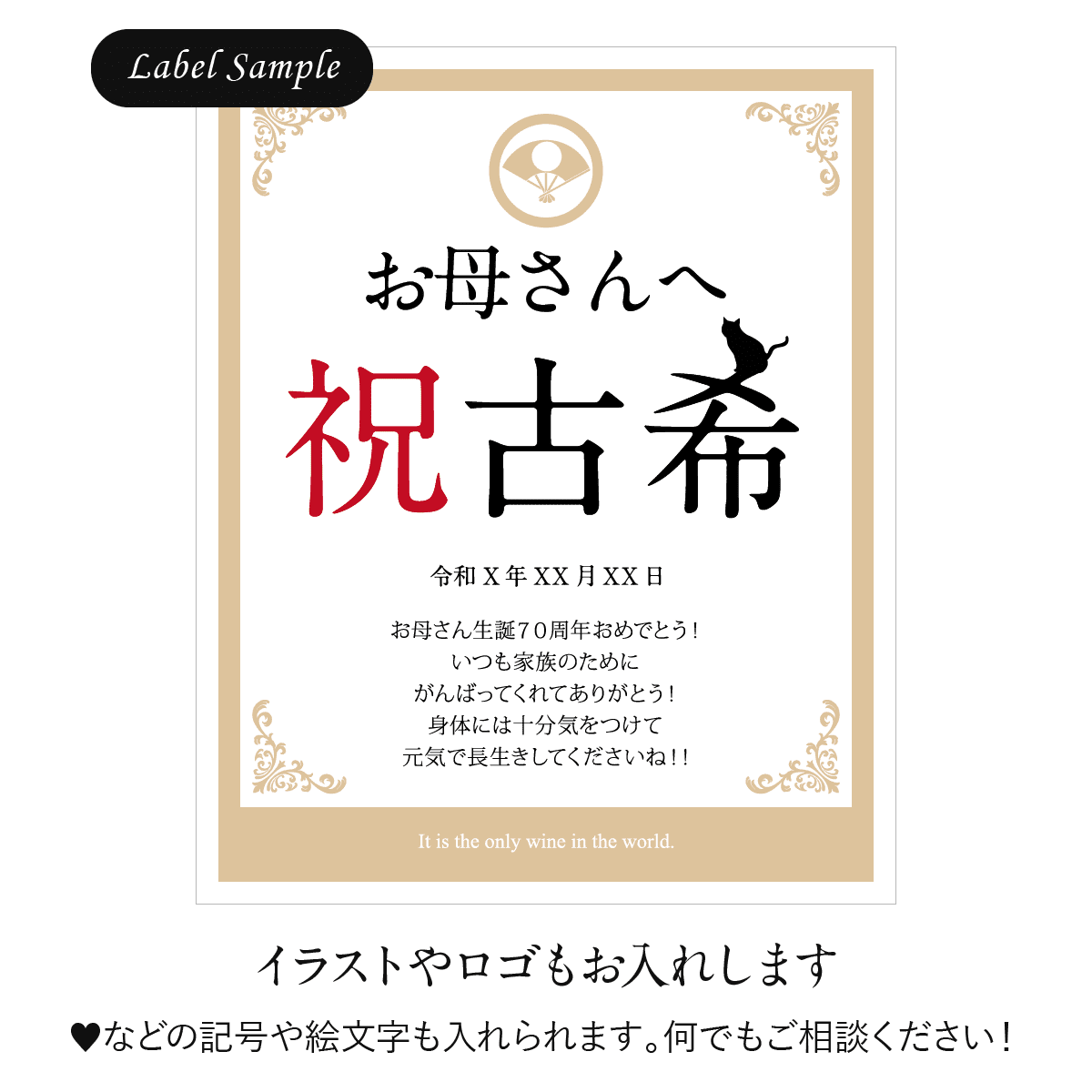 世界にひとつのオリジナルワインラベルをお作りいたします。ラベルは文字数制限なし、家紋やロゴ・イラスト等も可能です。お客さまのご希望に沿ったオーダメイドラベルをお作りいたします。