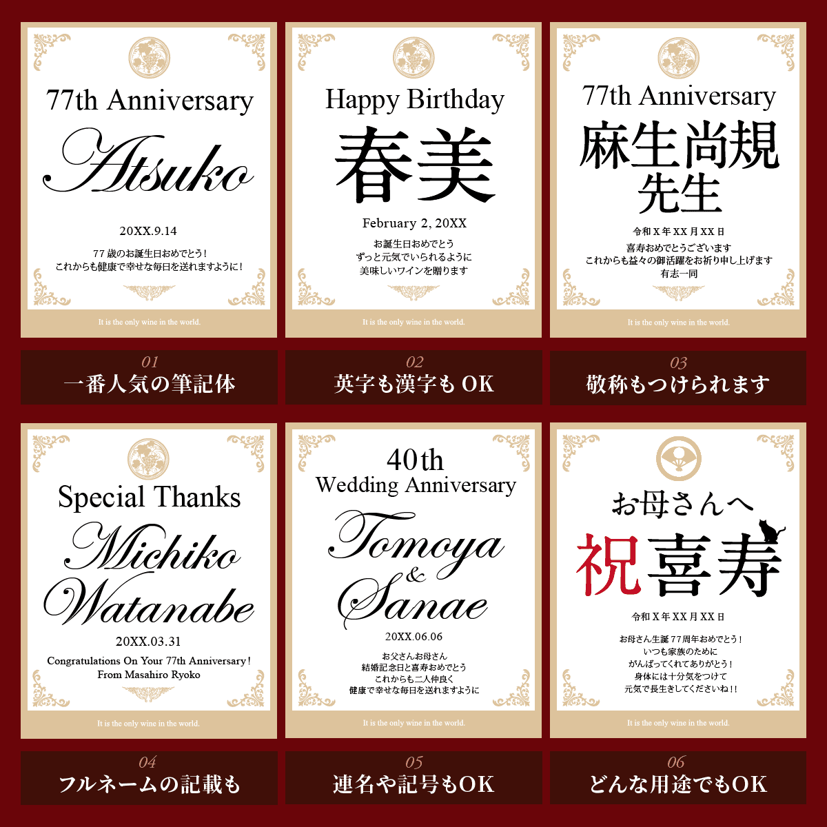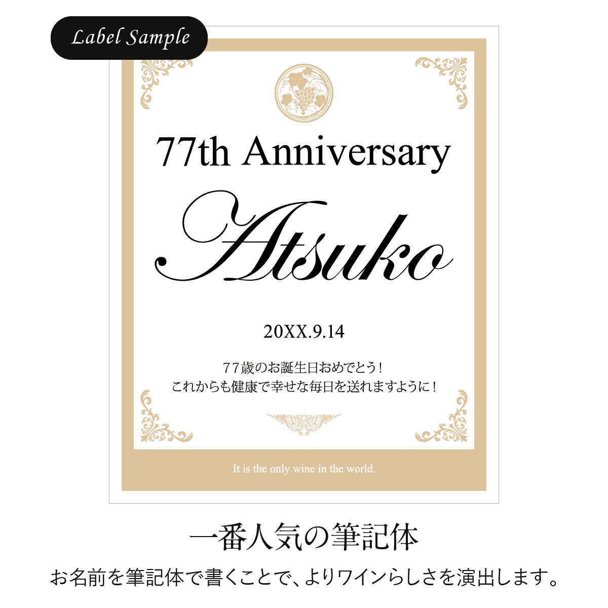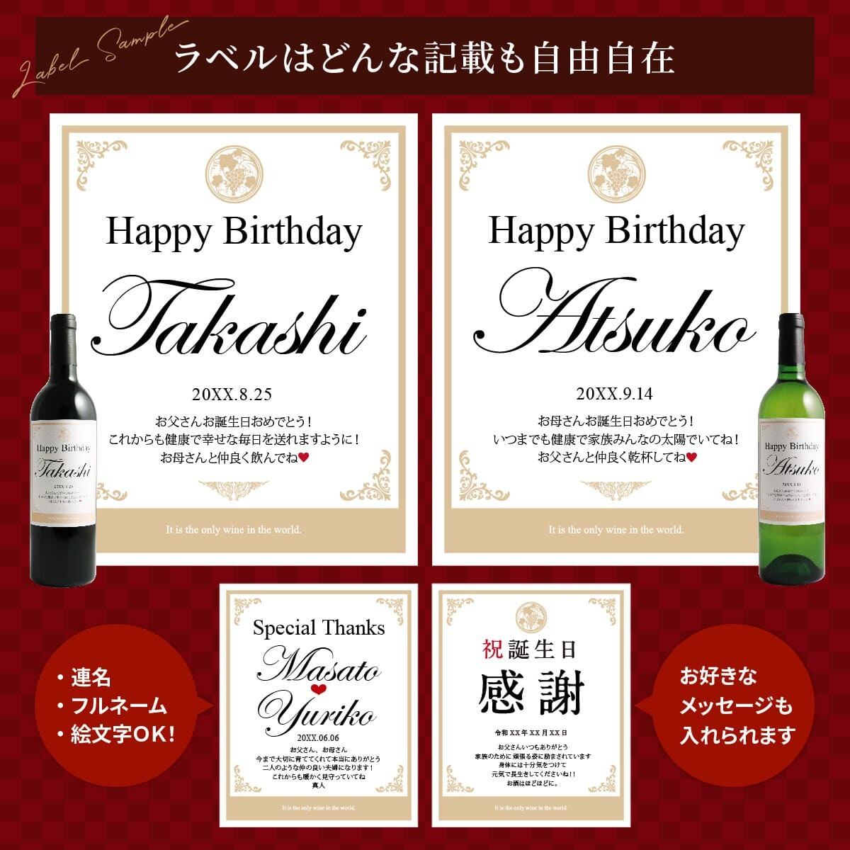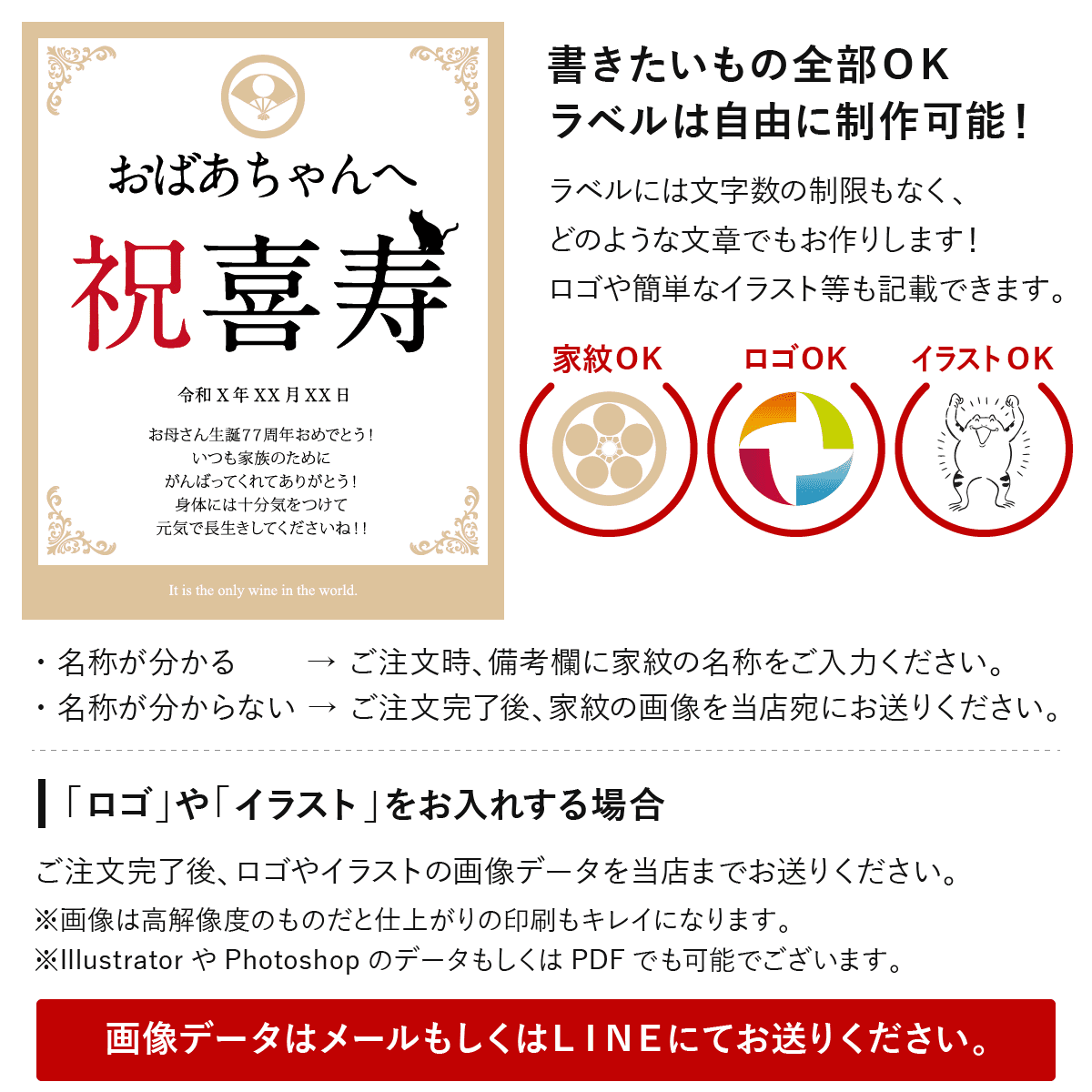世界にひとつのオリジナルワインラベルをお作りいたします。ラベルは文字数制限なし、家紋やロゴ・イラスト等も可能です。お客さまのご希望に沿ったオーダメイドラベルをお作りいたします。