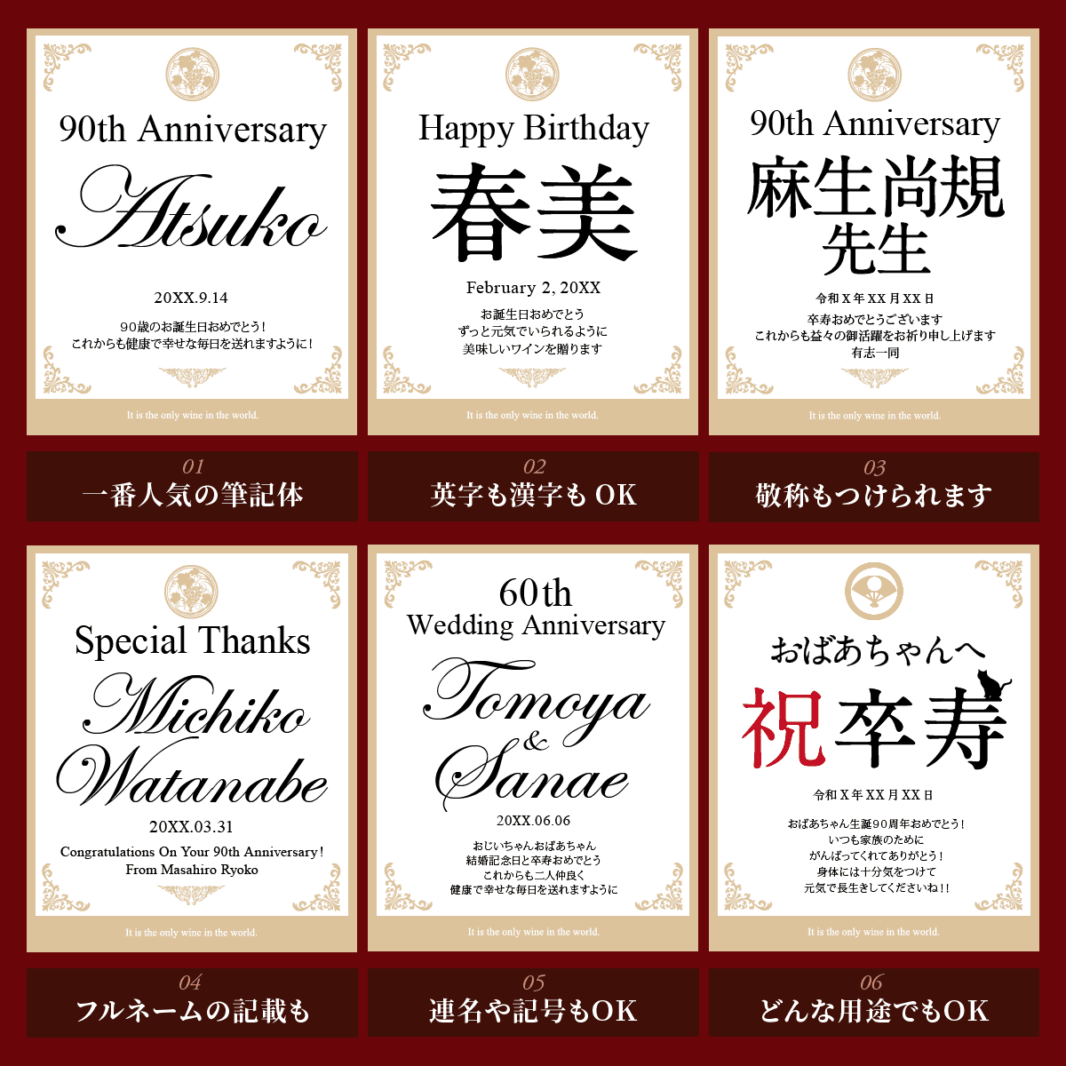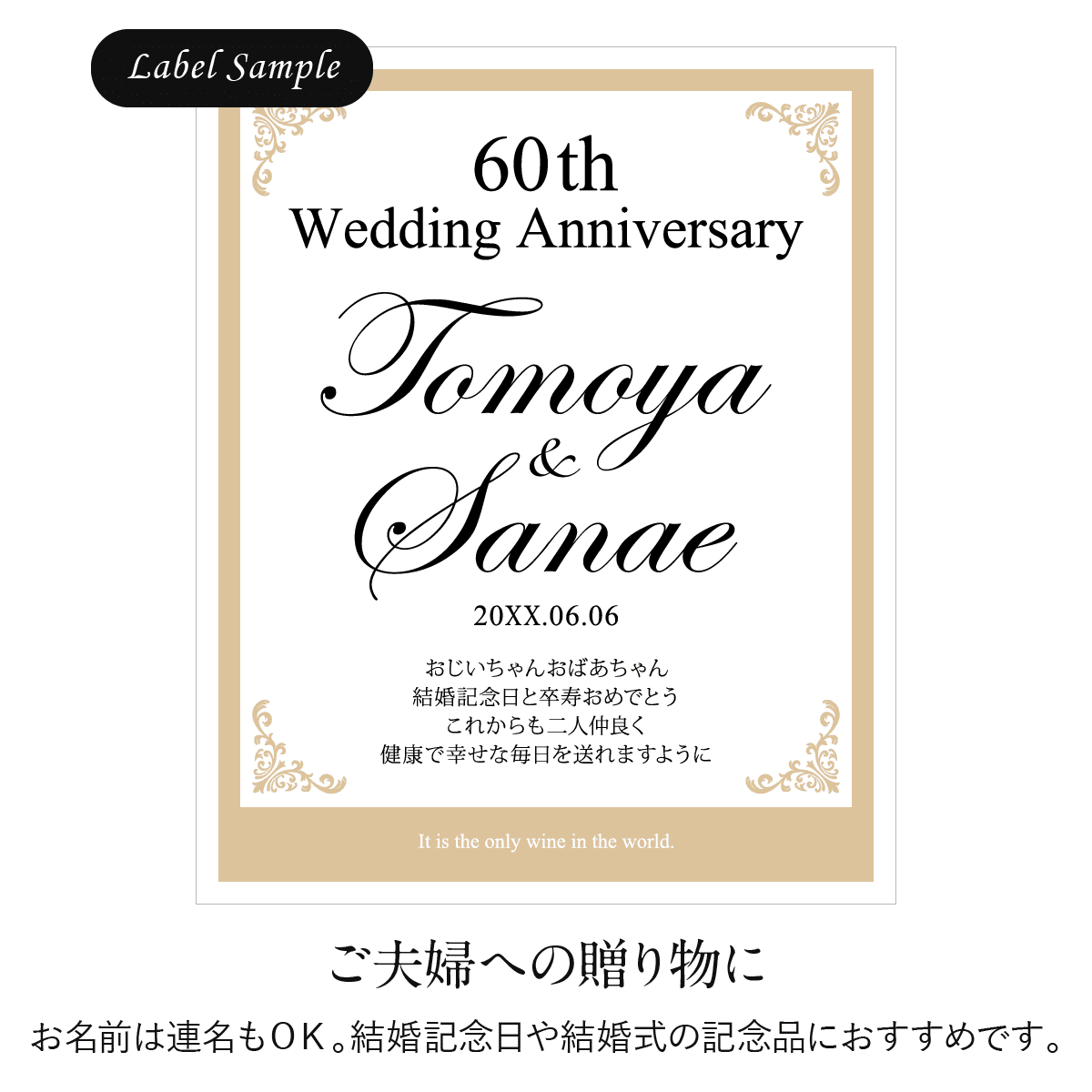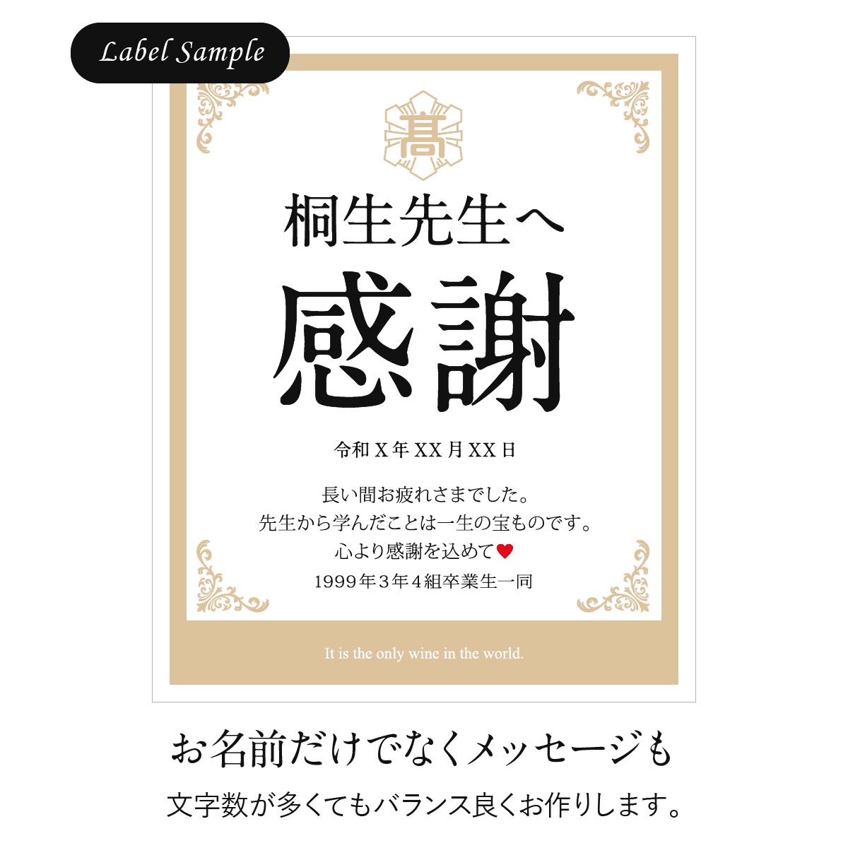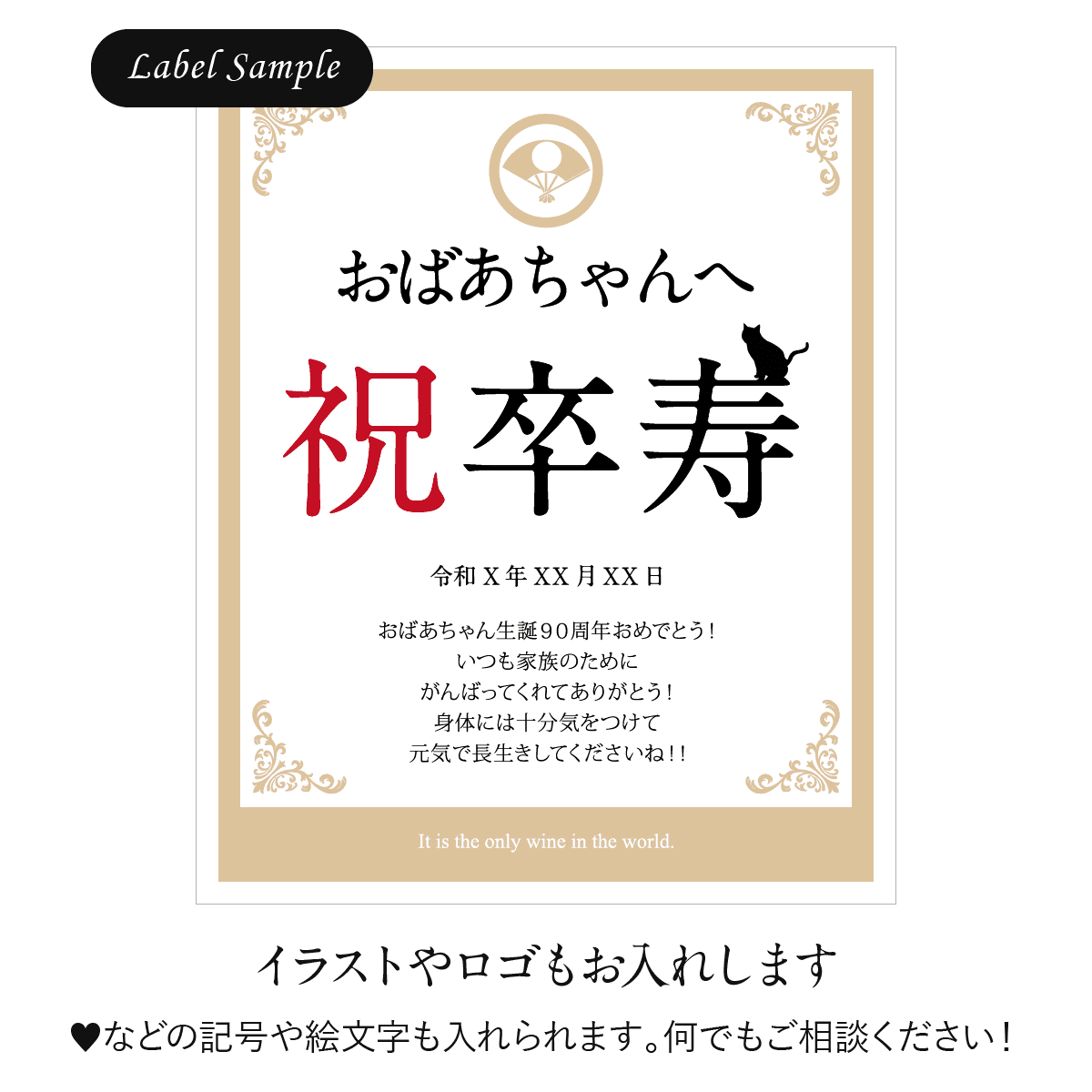 世界にひとつのオリジナルワインラベルをお作りいたします。ラベルは文字数制限なし、家紋やロゴ・イラスト等も可能です。お客さまのご希望に沿ったオーダメイドラベルをお作りいたします。