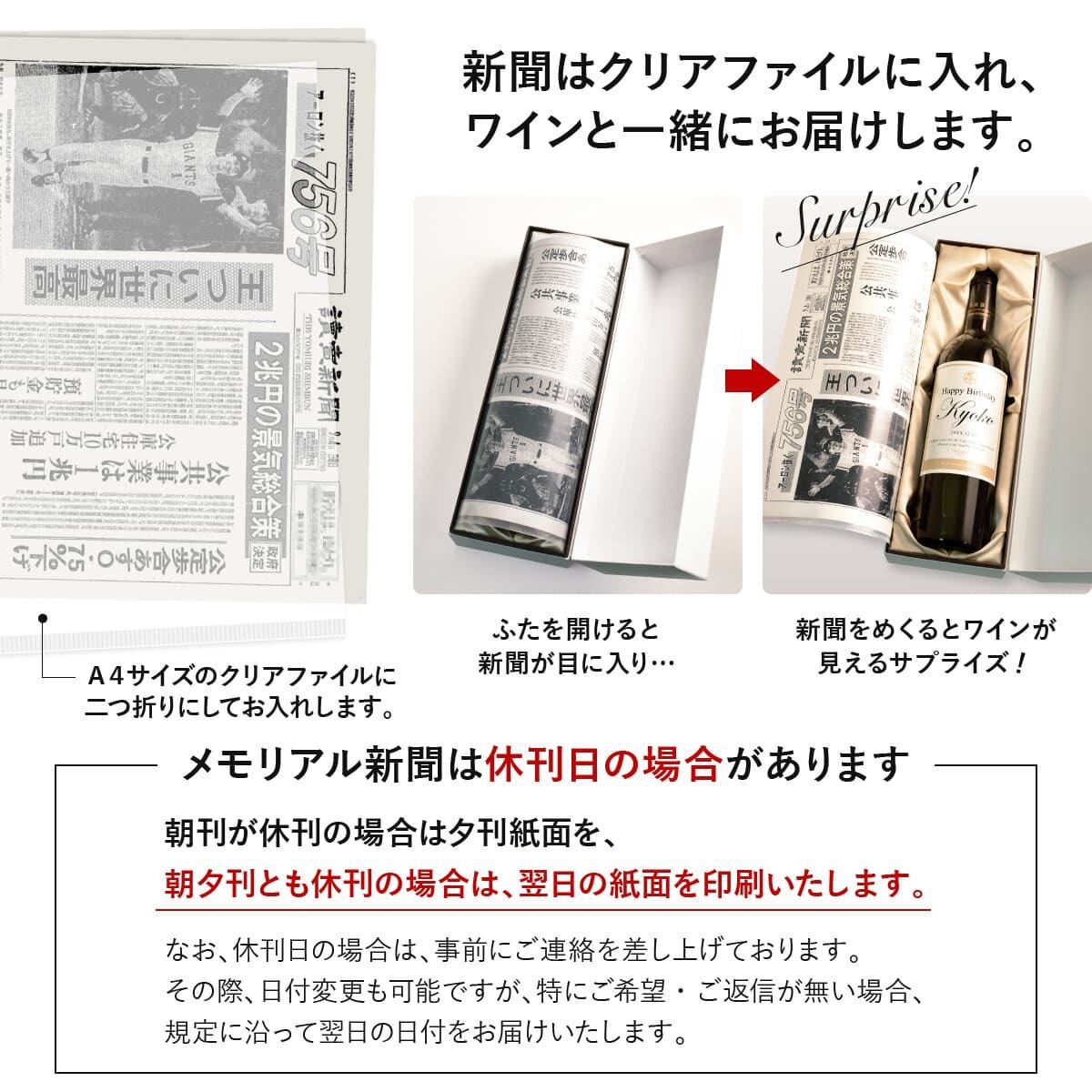 更に、ご希望の日付の1面を印刷した「メモリアル新聞」を1部お付けいたします。新聞日付は1874年~本日分までご用意しておりますので、誕生日や記念日等、お好きな日付をお選びくださいませ。※新聞社は「読売新聞」のみとなります。新聞社の指定はお受け出来ません。