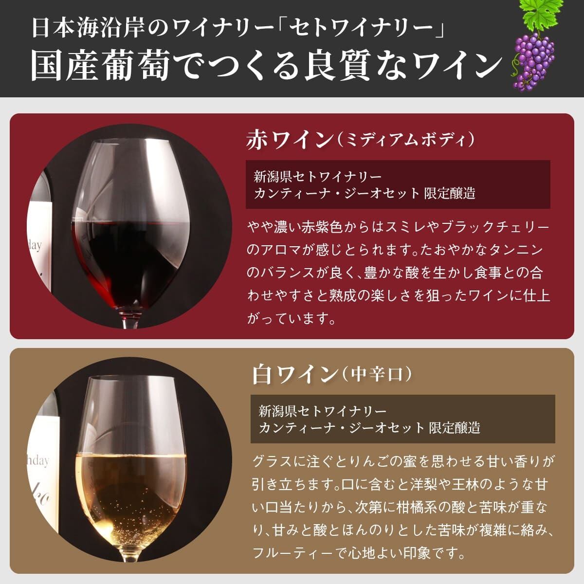 こちらのワインは日本海にほど近い新潟市の角田浜にある「セトワイナリー」で醸造されています。青い海と草花彩る山に囲まれた風光明媚な景色の中、ぶどう栽培とワイン醸造を自ら行っている新鋭のワイナリーです。赤ワインは少しスパイシーな香りと柔らかな酸味、たおやかなタンニンのバランスが良く余韻は長く重すぎることのない味わい。白ワインは口に含むと洋梨や王林のような甘い口当たりから、次第に柑橘系の酸と苦味が重なり、甘みと酸とほんのりとした苦味が複雑に絡み、フルーティーで心地よい印象です。
