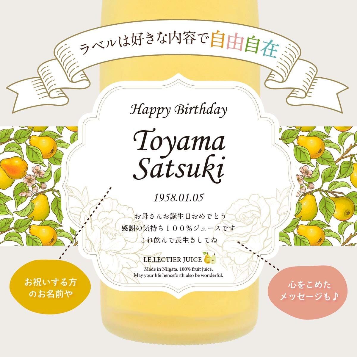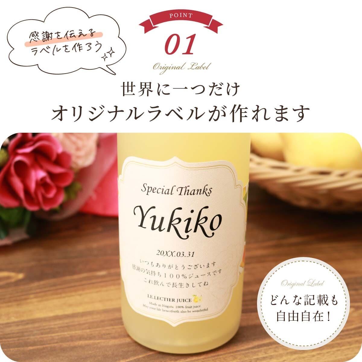 世界にひとつのオリジナルジュースラベルをお作りいたします。ラベルは文字数制限なし、家紋やロゴ・イラスト等も可能です。お客さまのご希望に沿ったオーダメイドラベルをお作りいたします。
