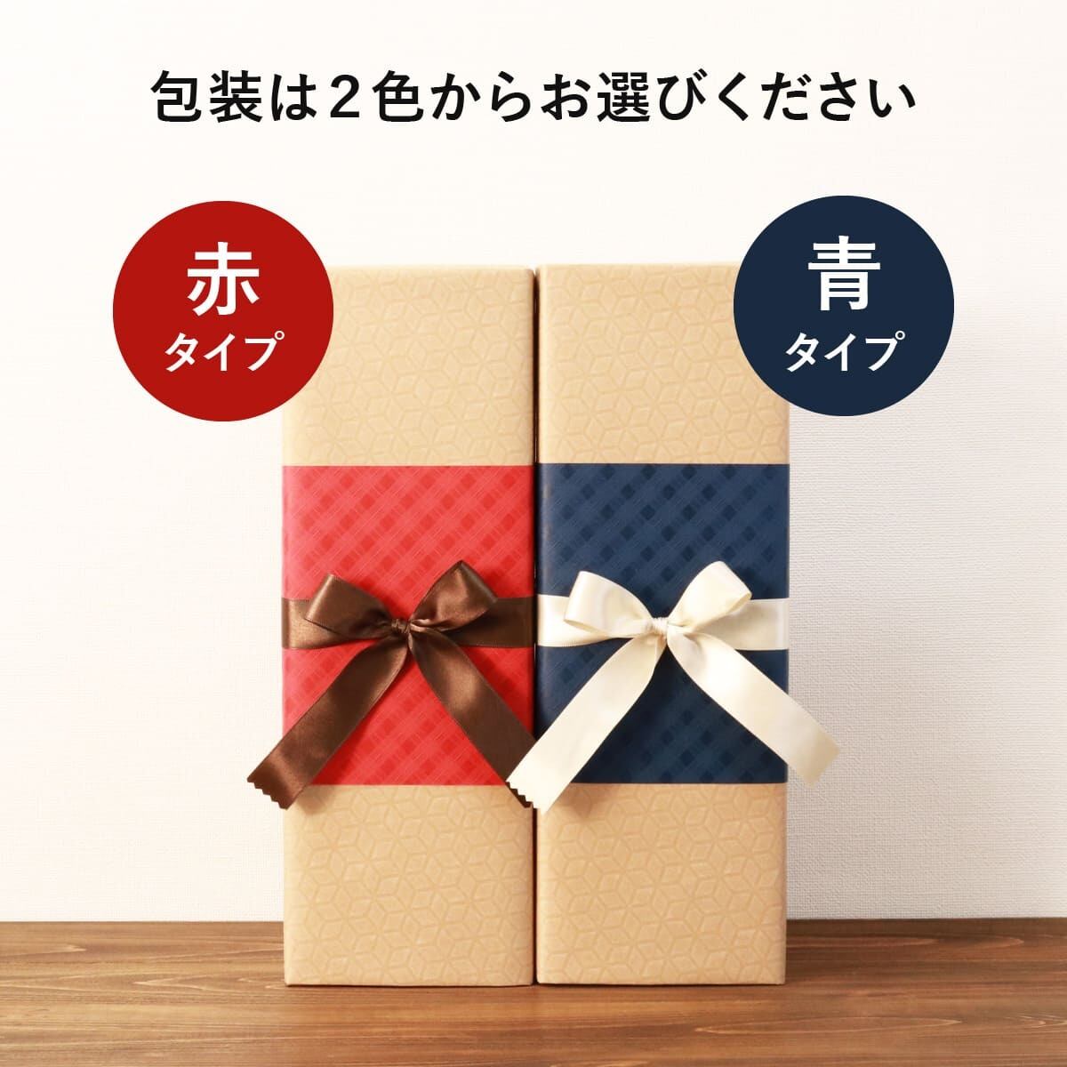 ジュースとメモリアル新聞はギフト箱に入れ、包装紙でお包みした上にリボンをお掛けいたします。包装は「赤タイプ」と「青タイプ」をご用意しておりますので用途にあわせてお選びください。