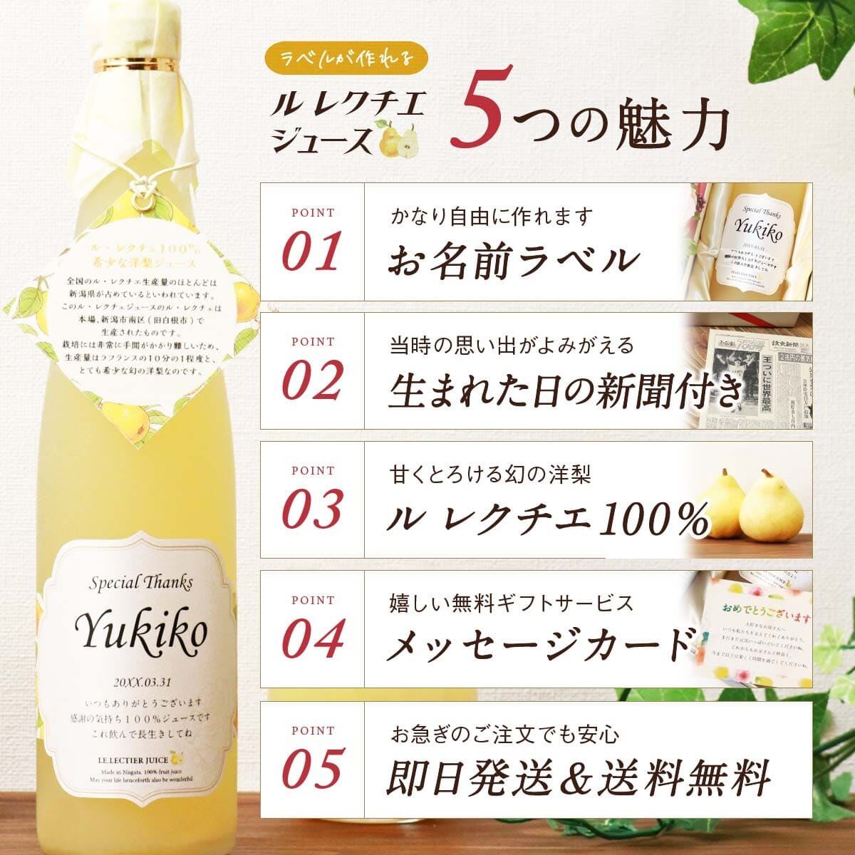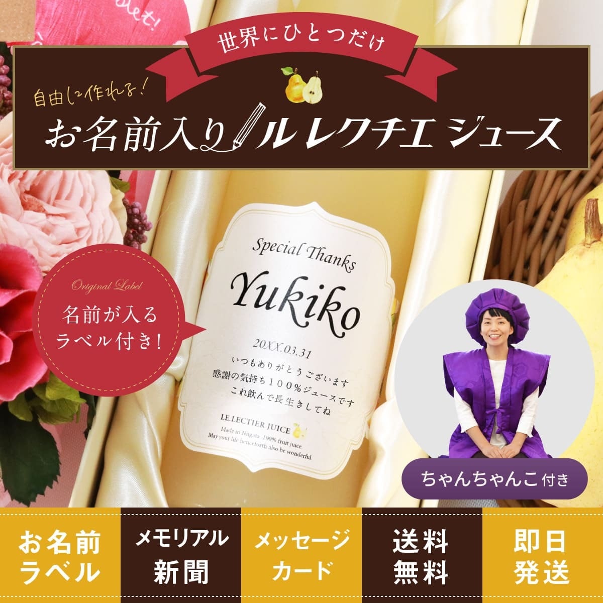 こちらの名入れジュースは当店営業日15時までのご注文で即日発送が可能です。お急ぎのお客様は「配送日付:指定なし」を選択の上、備考欄に『即日発送希望』とご入力くださいませ。※15時以降のご注文、及び、当店休業日のご注文は最短で翌営業日の発送となりますのでご注意ください。