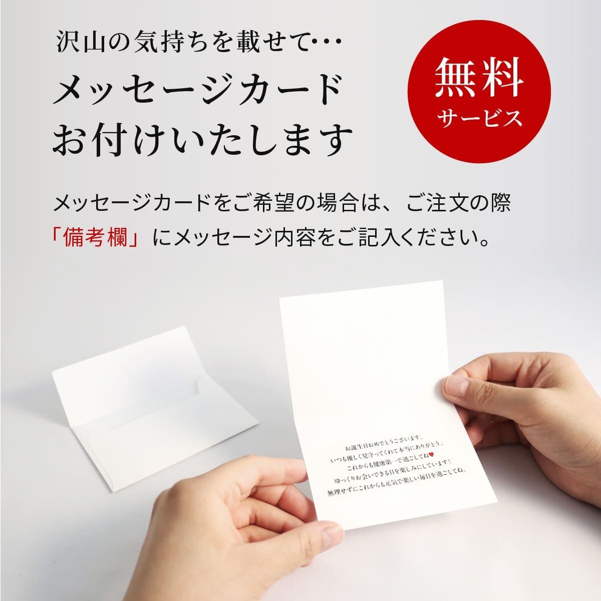メッセージカードは無料でお付けいたします。ご希望のお客様は「備考欄」にてお申し付けくださいませ。※入力方法は商品写真をご確認ください。