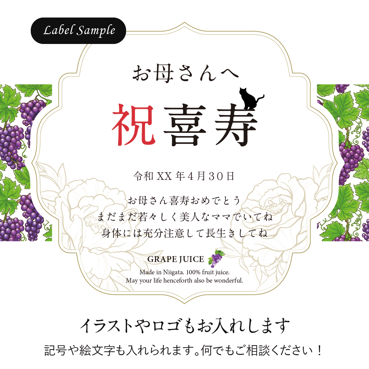 世界にひとつのオリジナルジュースラベルをお作りいたします。ラベルは文字数制限なし、家紋やロゴ・イラスト等も可能です。お客さまのご希望に沿ったオーダメイドラベルをお作りいたします。