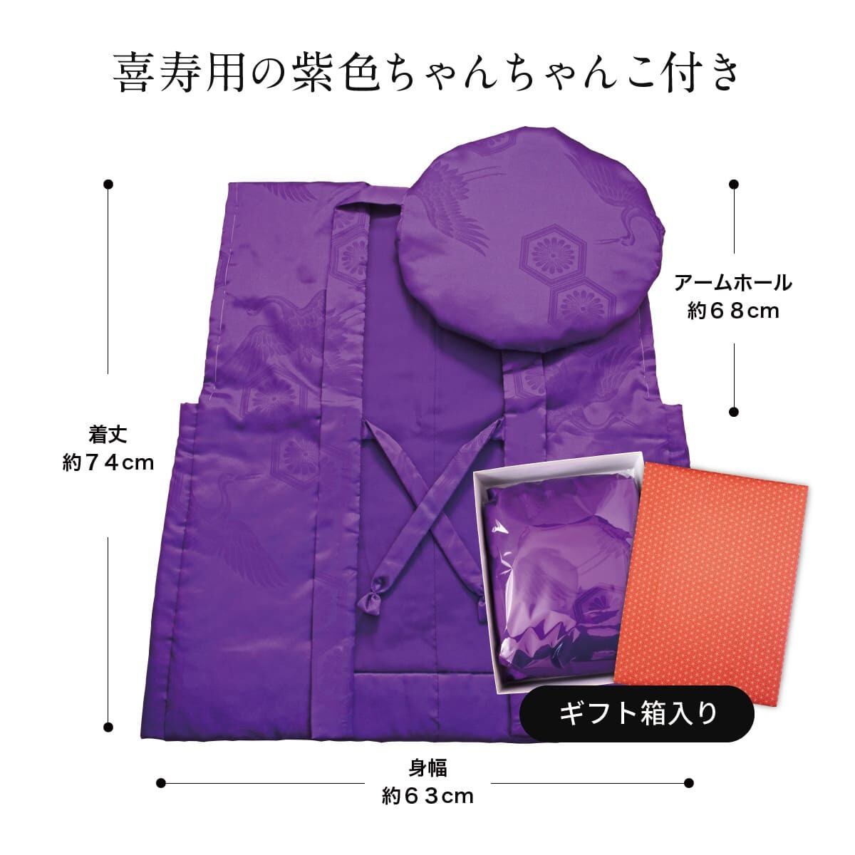 喜寿祝い用の紫色ちゃんちゃんこと大黒頭巾のセットをお酒と一緒にお届けいたします。前紐で調整できるフリーサイズで、大柄な男性から小柄な女性まで着ていただけます。