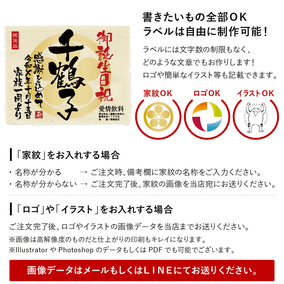 体に嬉しい成分たっぷりの紫蘇ジュースに、世界にひとつのオリジナルラベルをお付けいたします。ラベルは文字数制限なし、家紋やロゴ・イラスト等も可能です。お客さまのご希望に沿ったオーダメイドラベルをお作りいたします。