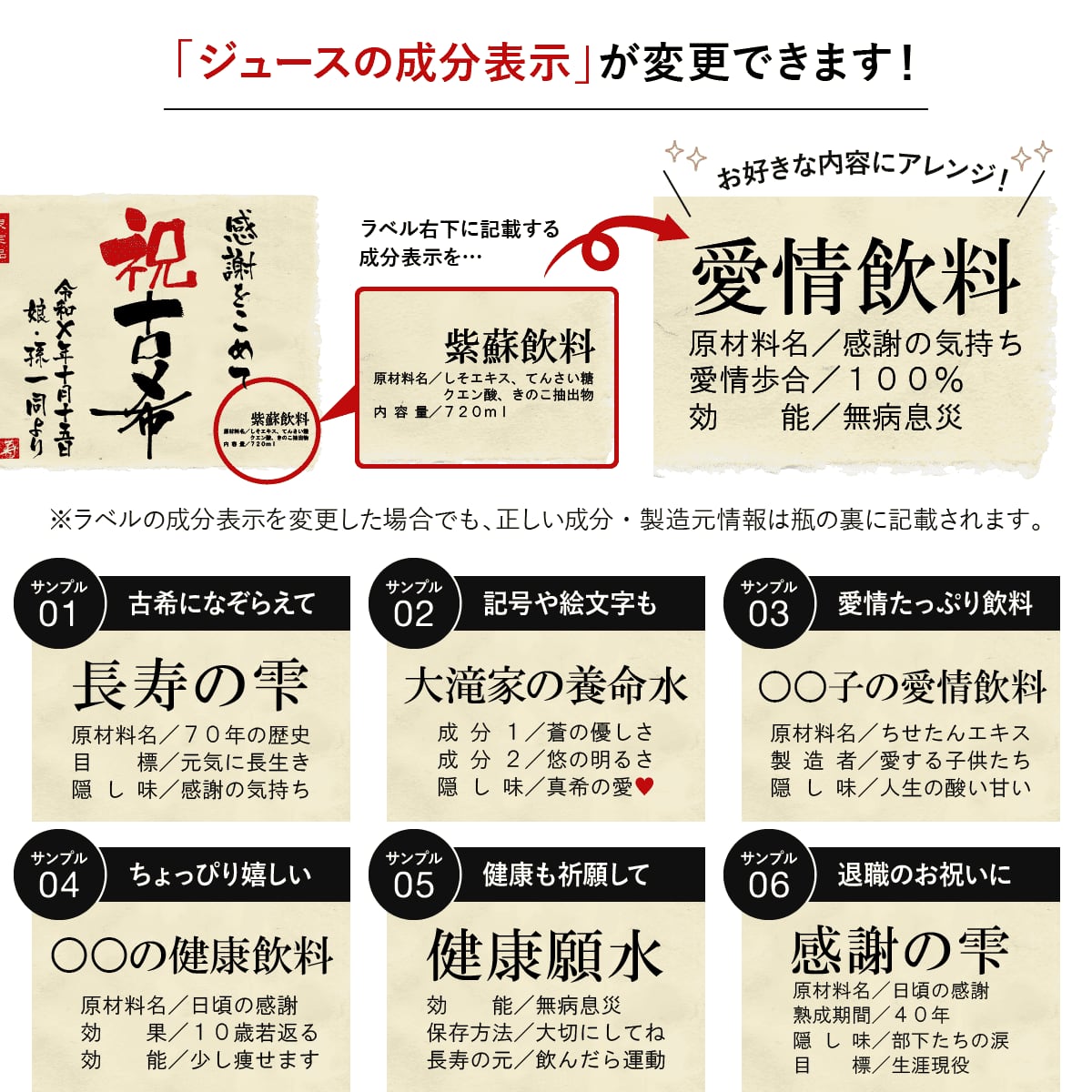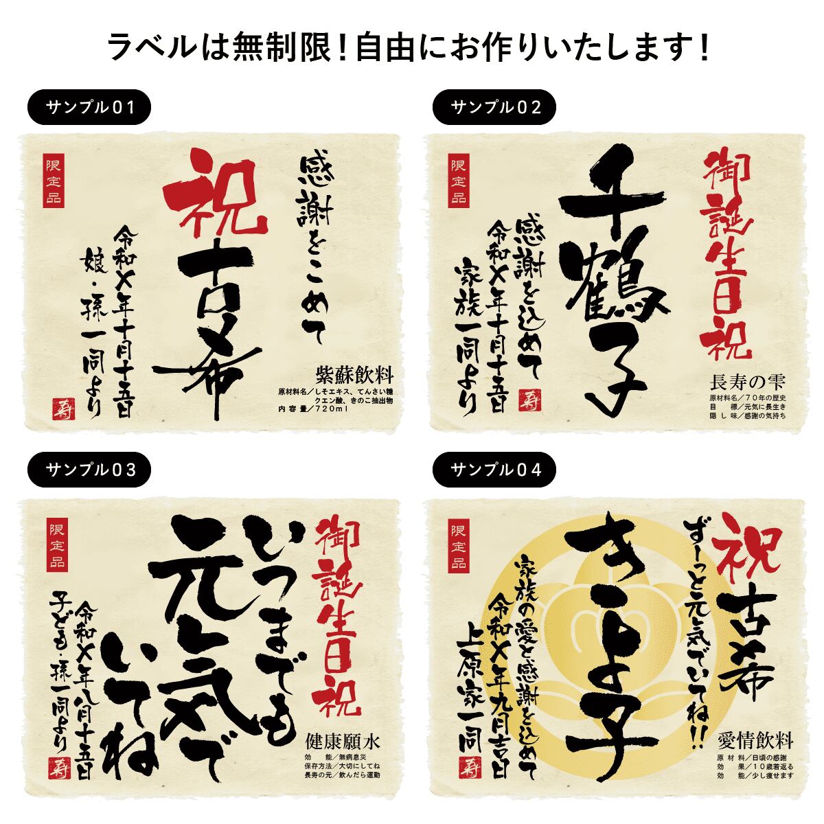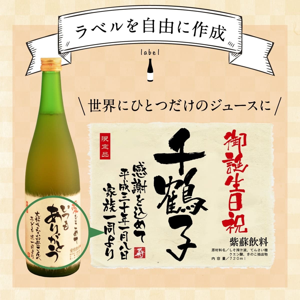 体に嬉しい成分たっぷりの紫蘇ジュースに、世界にひとつのオリジナルラベルをお付けいたします。ラベルは文字数制限なし、家紋やロゴ・イラスト等も可能です。お客さまのご希望に沿ったオーダメイドラベルをお作りいたします。
