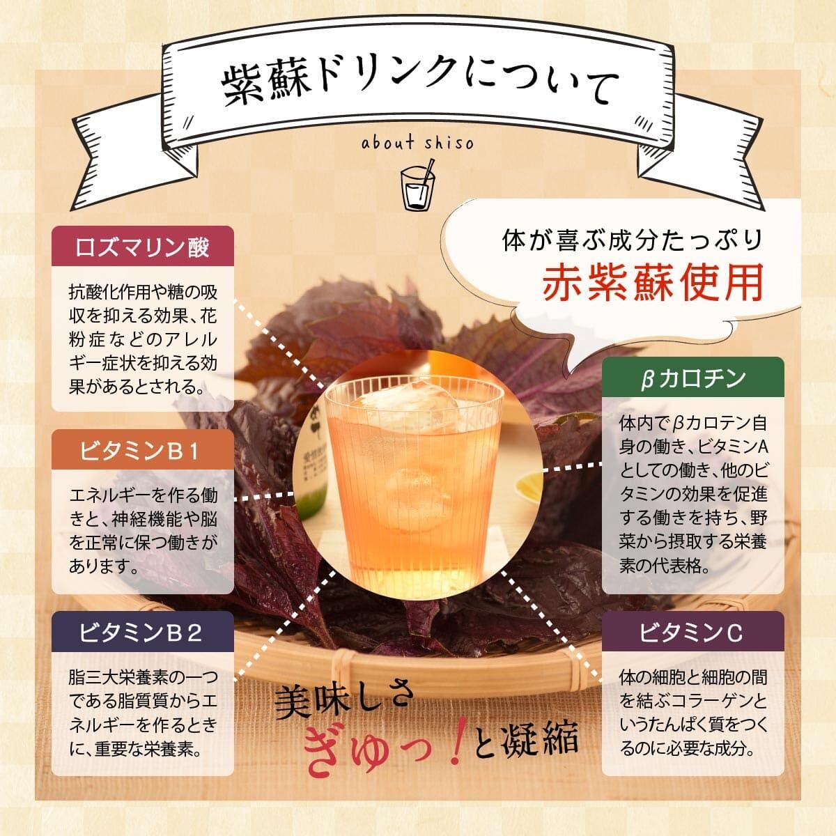 [原材料]赤紫蘇濃縮液(赤紫蘇原産国:日本、中国)、還元水飴、酒精、酸味料(クエン酸)、てんさい糖、きのこ抽出物